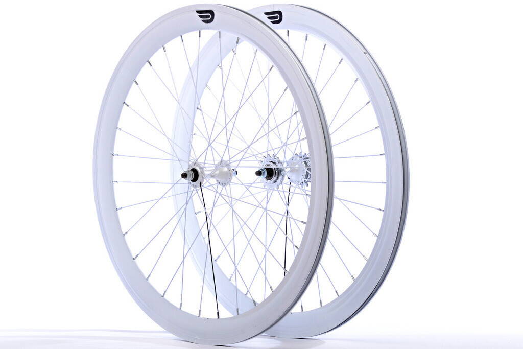 Набор колес (переднее и заднее) Pure Fix с высотой профиля 50 мм. Изготовлены из алюминия с двойной стенкой, размер - 700C (28"). Колеса оснащены втулками KT Quando. На заднем колесе размещена двухсторонняя втулка flip-flop с установленной фиксированной звездой 16Т и звездой 16Т со свободным вращением для езды в режиме single-speed. На каждом колесе размещены 32 спицы. Наборы оснащены нейлоновыми лентами для защиты камеры.