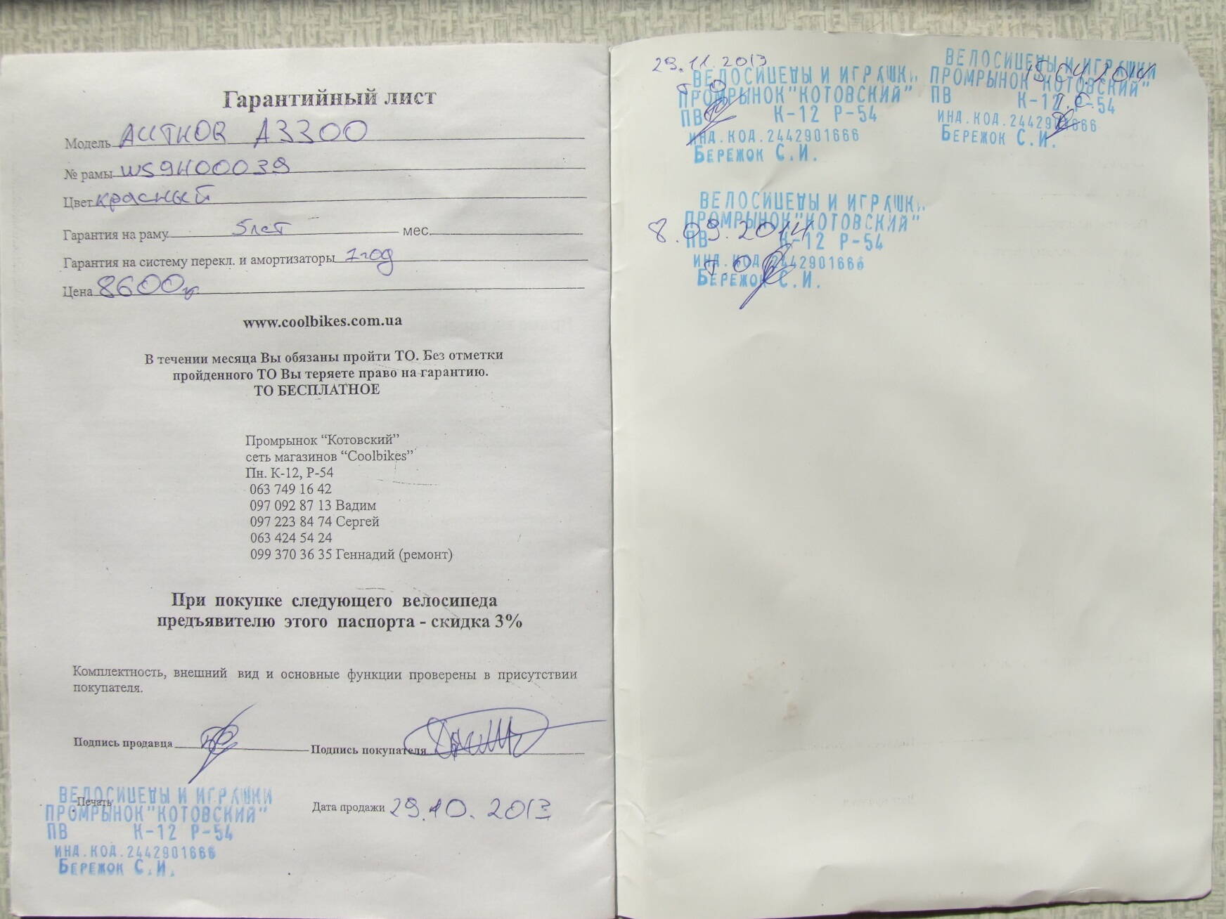 За велосипедом смотрел и пылинки с него сдувал - каждые несколько месяцев проходил ТО. Тогда покупал за 8600 грн - 1050 $ по тогдашнему курсу (см. последнее фото)