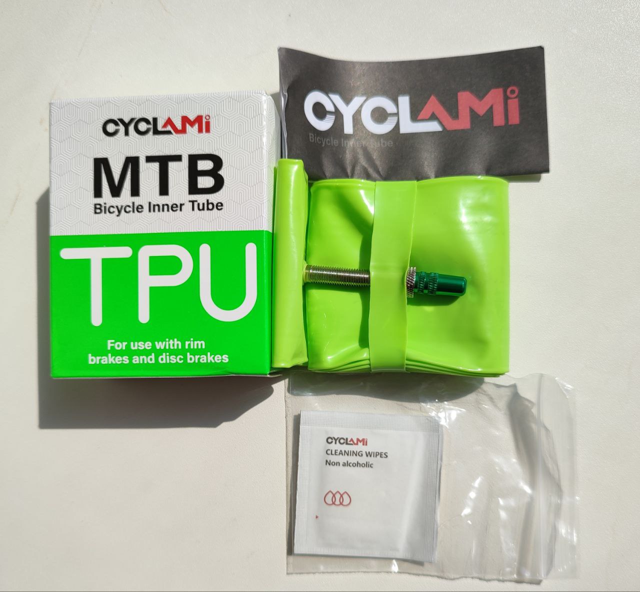 Сверхлегкая велосипедная камера MTB 29 (1.9-2.5) дюймов, 65 грамм. Также в 1-й коробке есть ремкомплект из 2-х заплаток. Для исправления повреждений клей не требуется. Камеру нужно протиреть влажной салфеткой (есть в наборе) и приклеять латку. После можно сразу использовать.