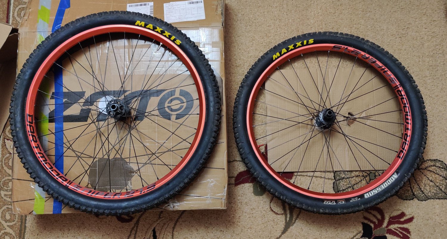 Вілсет 27.5 на ободах Dartmoor Sniper в кольорі "червоний анод" (як відомо, червоний їде швидше), якскравий, міцний, покри гарні для трейлового використання і в відмінному стані. Втулки гарний перевірений китай клон DT на ратчеті, тільки но обслужені у гарного майстра (включно з промами, частину яких замінили на нові коли перезбирав байк з 27.5 на 29, і після не катали).