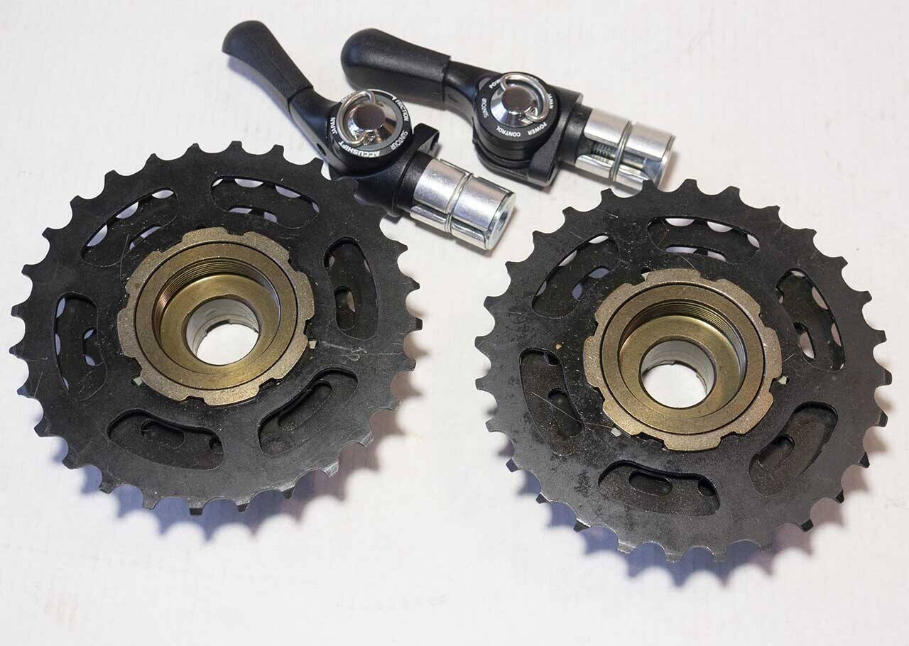 New-Old-Stok. НОВЫЕ!!!! Винтаж из 1980-х. Неспешно продам комплект: две новые японские манетки Suntour Accuhift, в торец руля, bar end shifter. Правая манетка индексная, на 6 скоростей, система "accushift", и левая манетка безиндексная "Powershift" 2-3 скорости.