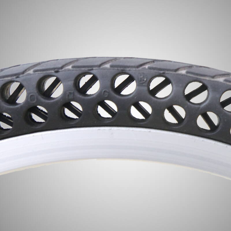 Безвоздушная антипрокольная перфорированная покрышка имеет массу преимуществ. Она не может потерять форму и стать негодной для использования от прокола. Её ресурс больше чем у обычных безвоздушных шин. Отлично показывает себя как на морозе, так и на жаре. Размеры в скобках-это внутренняя ширина обода. У нас вы можете заказать такие размеры: