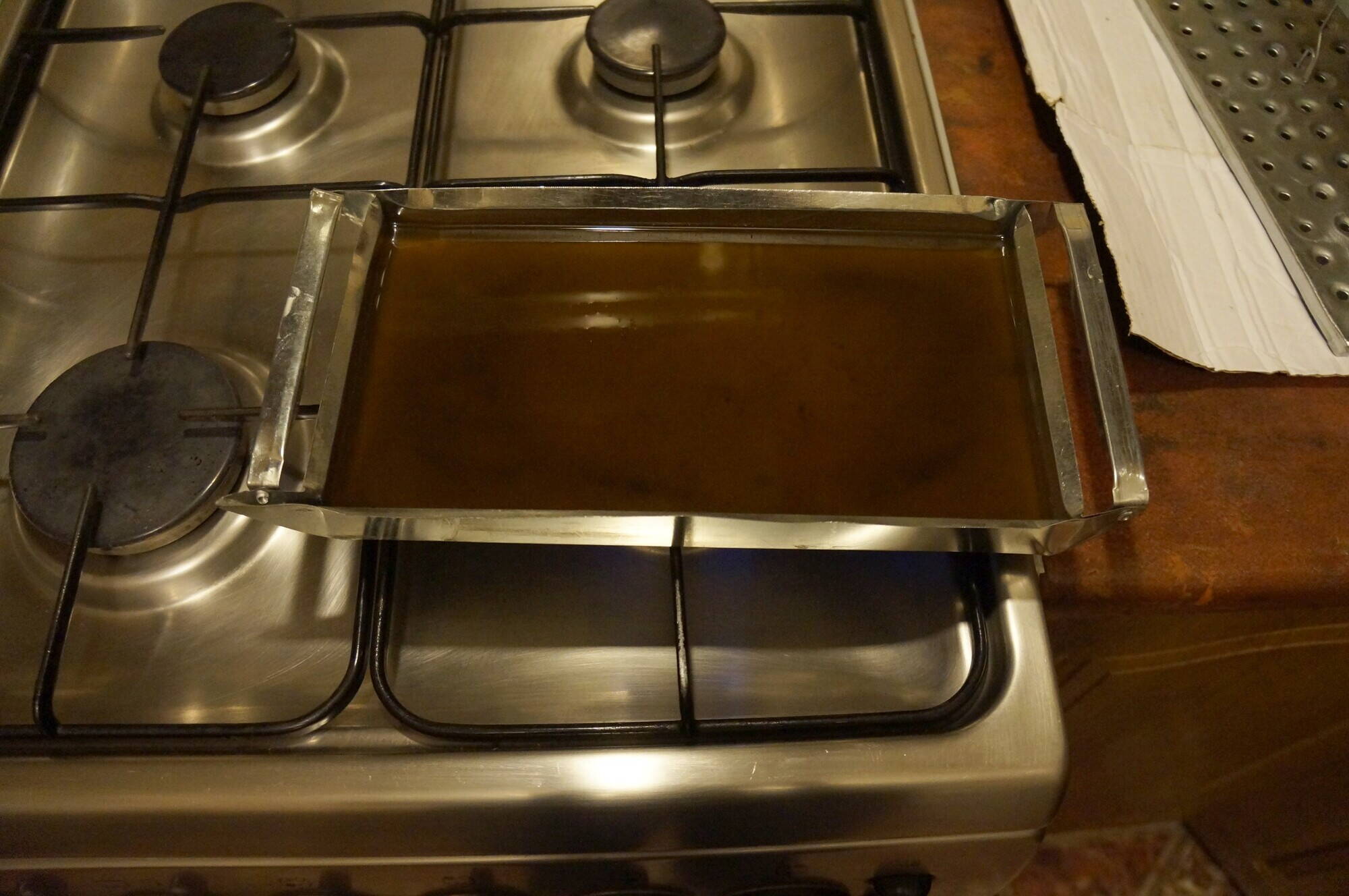 2 стадія парафінення. Далі розтопив в парафінерці парафін і віск у пропорції 4:1 на мінімальному газі. Температуру підтримував близько 100 оС за допомогою пірометра вимикаючи час від часу газ. Проварив прокручуючи ланцюг 10 хв. Після чого витер добре салфеткою, та встановив на велосипед. Парафін, після того як трошки вистиг злив в 2л пласт. пляшку, заливши на дно води як радили на форумі. змішувати парафін з водою як на мене погана ідея. Коли парафінив другий свій ланцюг то залишки води в парафіні булькали і стріляли, аж до повного википання.