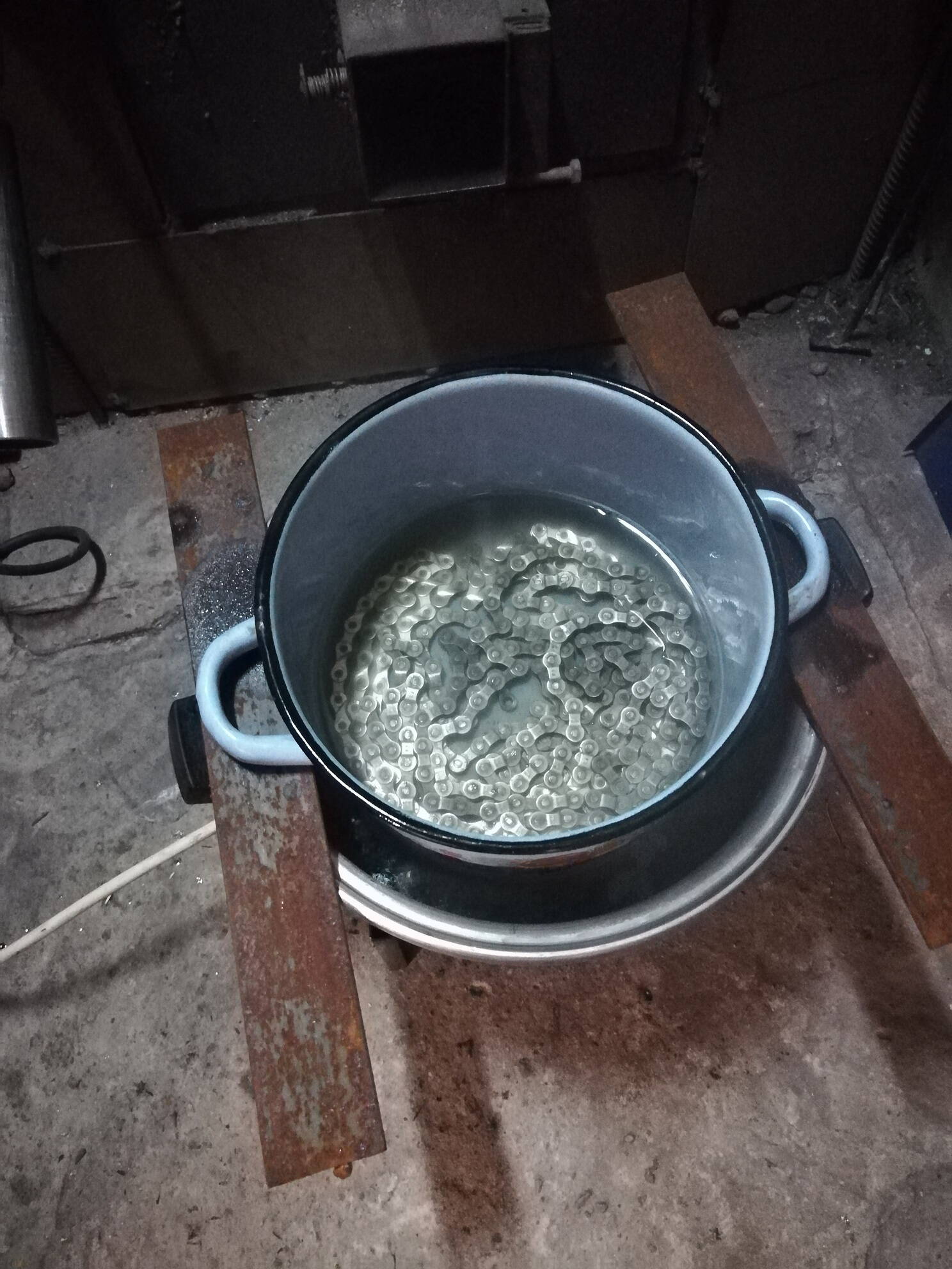 В многодневных возможен такой вариант: взять с собой плотный пакет (например из-под молока) с парафиновой стружкой. При необходимости варить, положить цепь в этот пакет и "сварить" в котелке. Места занимает минимум, весит граммы, пакет с остатками парафина потом сжигается на костре.