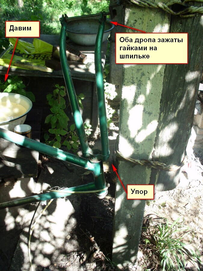 Рама если и от Украины, то от поздней (пост-СССР). Я такое ровнял на иномарке: хитрой приспособой (фактически прокладками со штырями в дырках от проворота) зафиксировал дроп в тисках, ещё один упор под изгибом, и за раму разогнул красиво.
