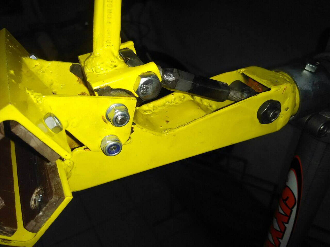 У П-образного профиля не достает одного ребра жесткости, от этого его и крутит. Если все же подвесить вел за верхнюю трубу переднего треугольника, то все норм, но работать-то приходится иначе. Выходом из положения стало добавление ребра. Пришлось доварить пластину. Так стало на много лучше – больше жесткости. Следует заметить, что толщина металла довольно посредственна по сравнению с формой профиля основания.