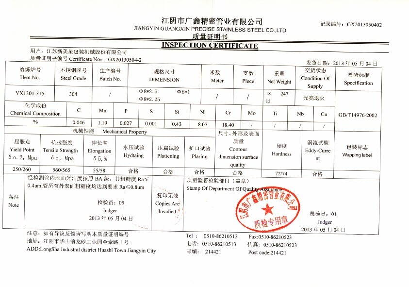 Вот китайский сертификат качества, его выдают в техническом отделе металлургического завода на каждую плавку.