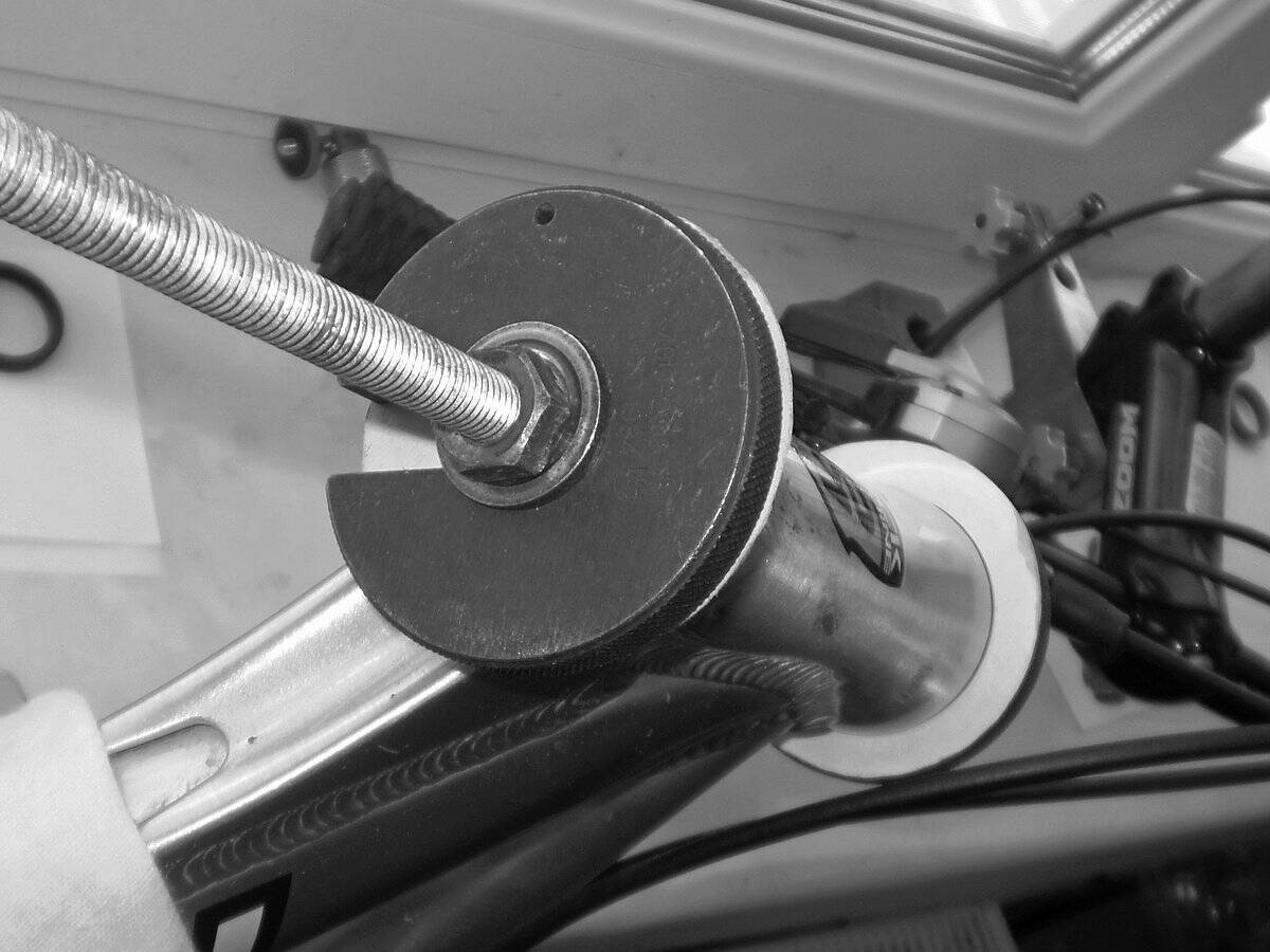 Так вот, принцип работы такой - болт вставляется внутрь рулевого стакана, сверху (так, где гайка) под шайбу с резиновой прокладкой (чтобы не повредить поверхность чашки) ставится чашка, далее закручивается гайка до момента лёгкой затяжки, после этого ровняются шайбы, чтобы всё было по центру, и спокойно крутим гайку, зажав шляпку болта ключом (хотя при затяжке он у меня вообще не двигался...), при чём довольно важный элемент - подшипник (без него конечно тоже можно, но так приятнее