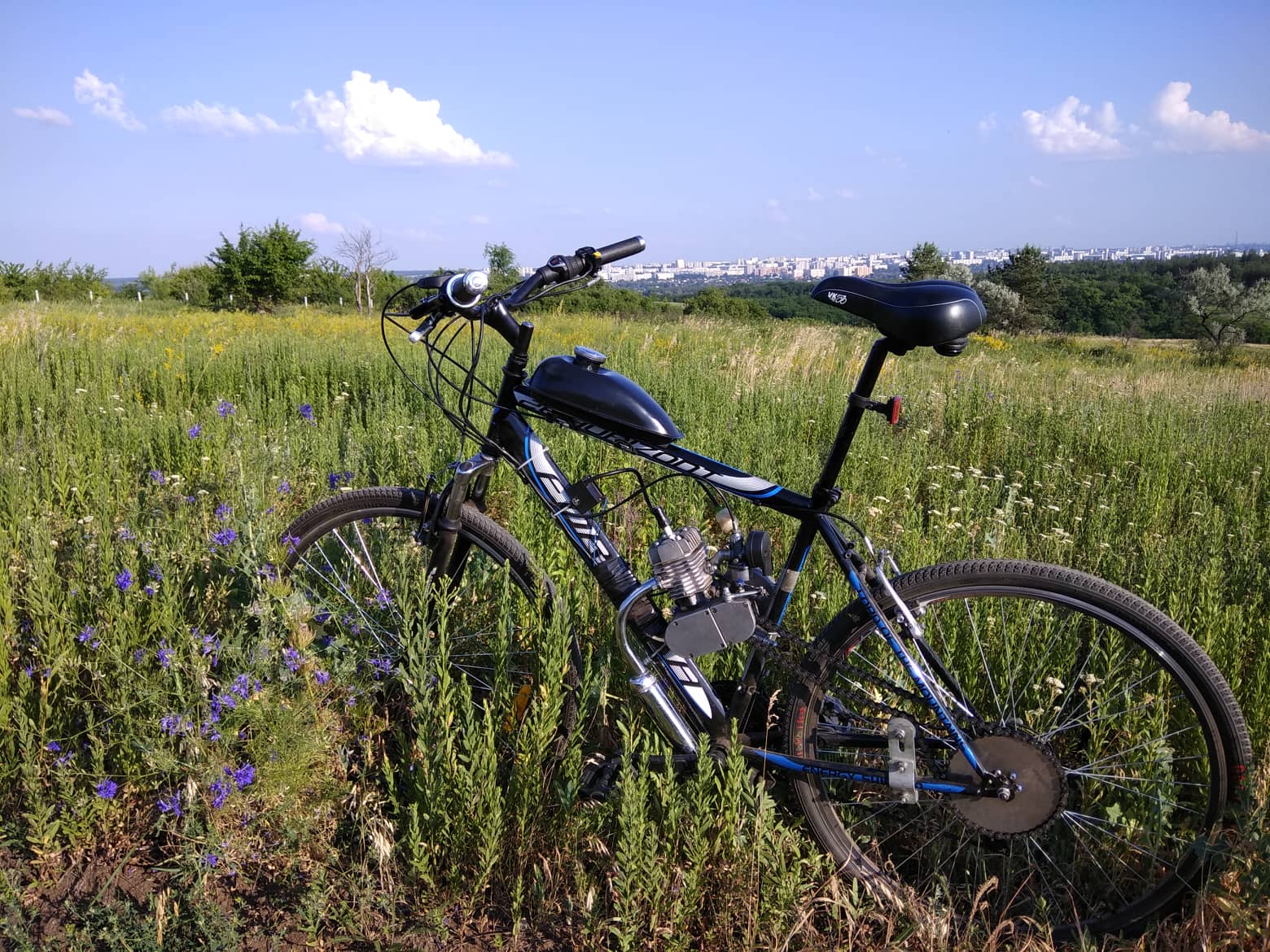 Установил китайский мотор "Кельбаджары" на велосипед Formula Horizont. Все куплено по отдельности на рынке им. Барабашова, $100 мотор и $100 велосипед (в эквиваленте). По сравнению с электровелосипедами - практически даром.