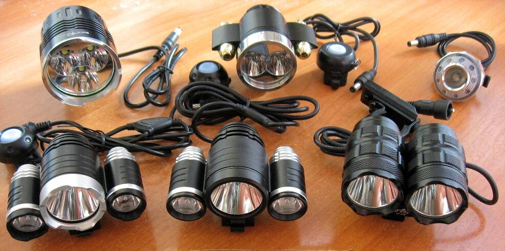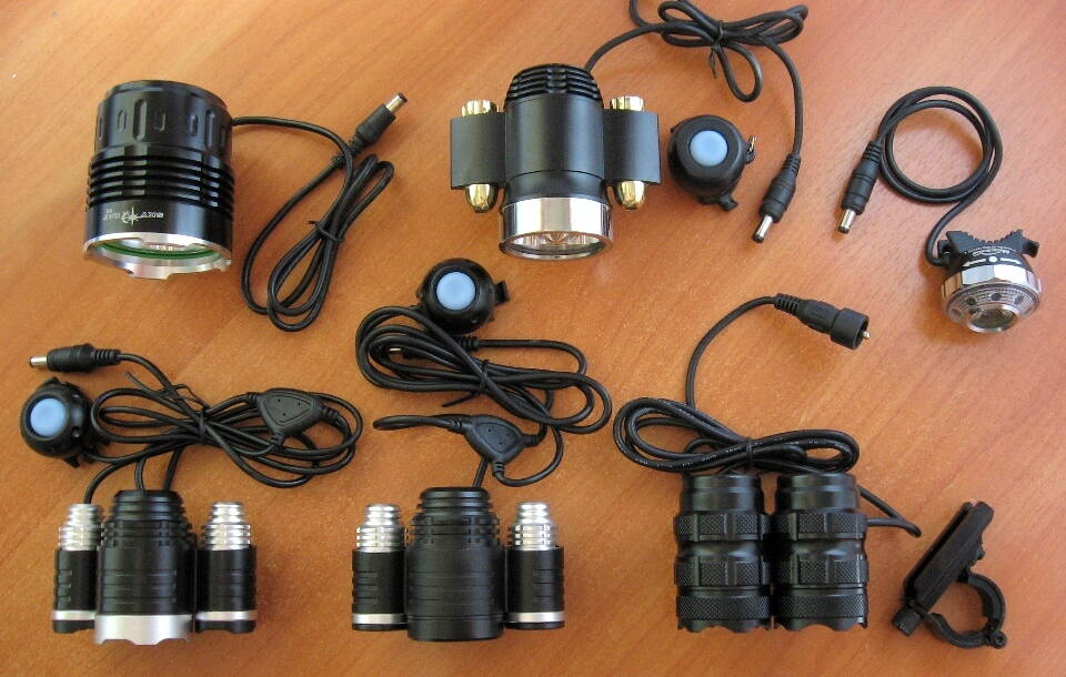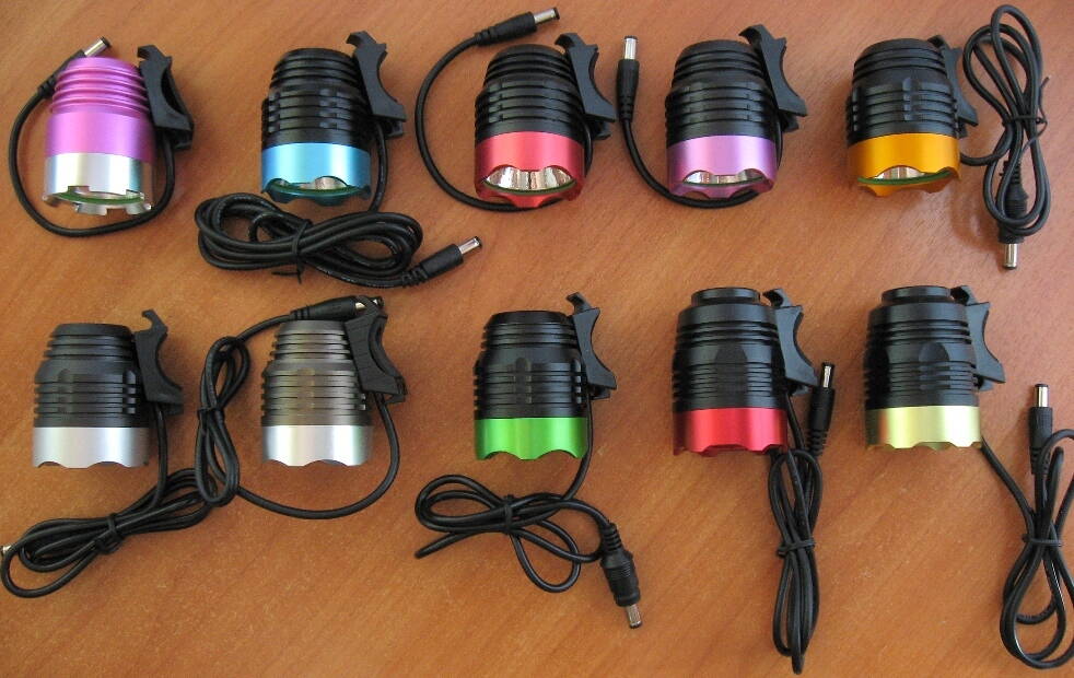 Общее фото всех велофар в наличии (некоторые варианты есть как с мятым так и с гладким рефлектором, на выбор):