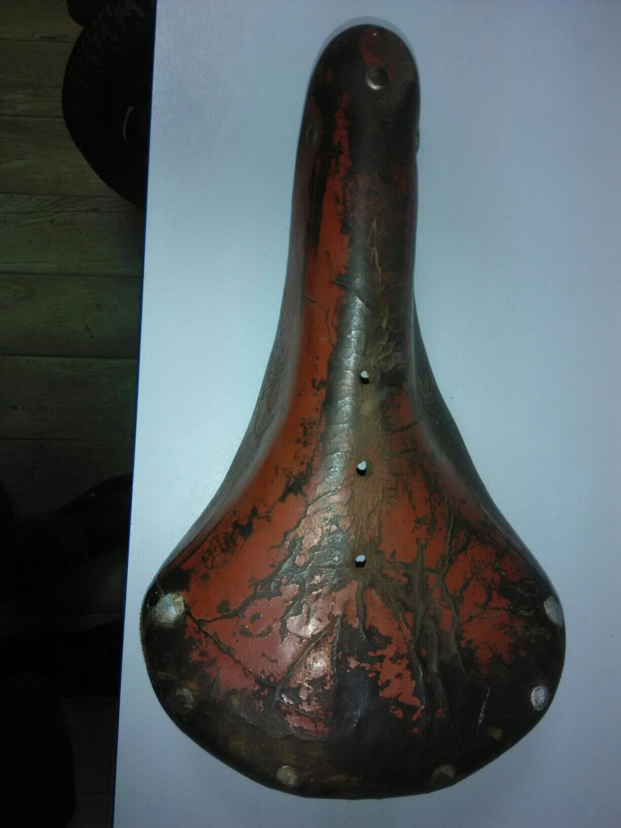 То которое сейчас разобрал - краска растрескавшаяся но была даже с внутренней стороны где кожа касается металла рамки, седло это имело не родные заклепки - стало быть