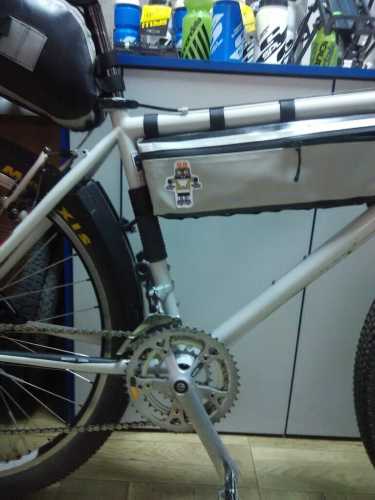 Внезапно пришла внутрирамная сумка. В нее планирую помещать все то что ездит сейчас евридеем в сумке в корзине. Сумка с торца имеет крепление молле по кругу, и к ней можно цеплять что то снизу (например свернутый в ролл палаточный тент с дугами).