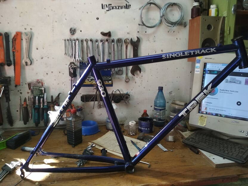 Последний год в связи с поставками из ЕС старых классных байков, настоящего тру винтажа, на который не тошнит вешать шикарные апгрейды. Из последних мне попался вот такой Стикс. был на кой то хрен покрашен серебристой краской. Смывал я ее долго, на что ушло 2 литра 650го и 3 кг ветоши. Благо родная краска и наклейи не пострадали от этой процедуры. понравился обвес Point by Formula. втулки, перекиды,тормоза кнтилеверы. Манетки Шимано родные отлично переключают после изгнания семей пауков. Конечно тросики и рубахи на помойку. Смазку родную туда-же. так же пришлось выкинуть шатуны и каретку. разобрать не смог. пришлось срезать.