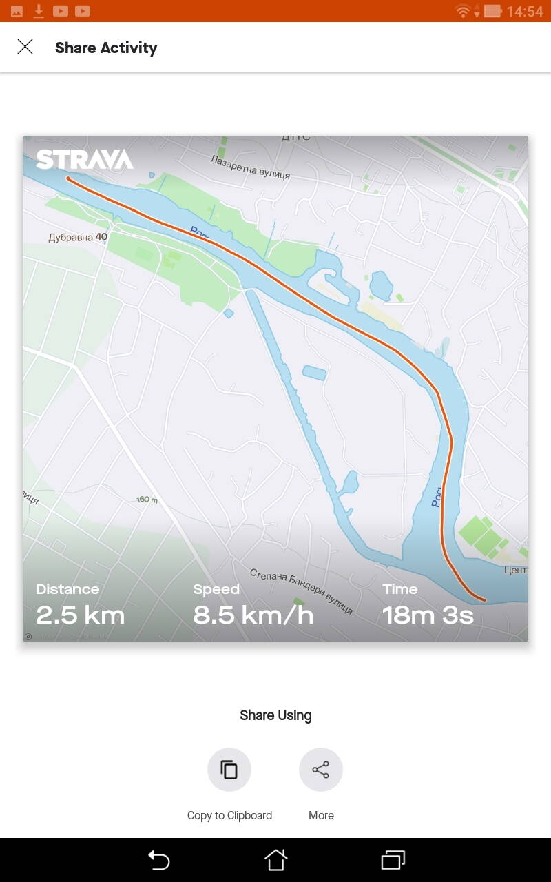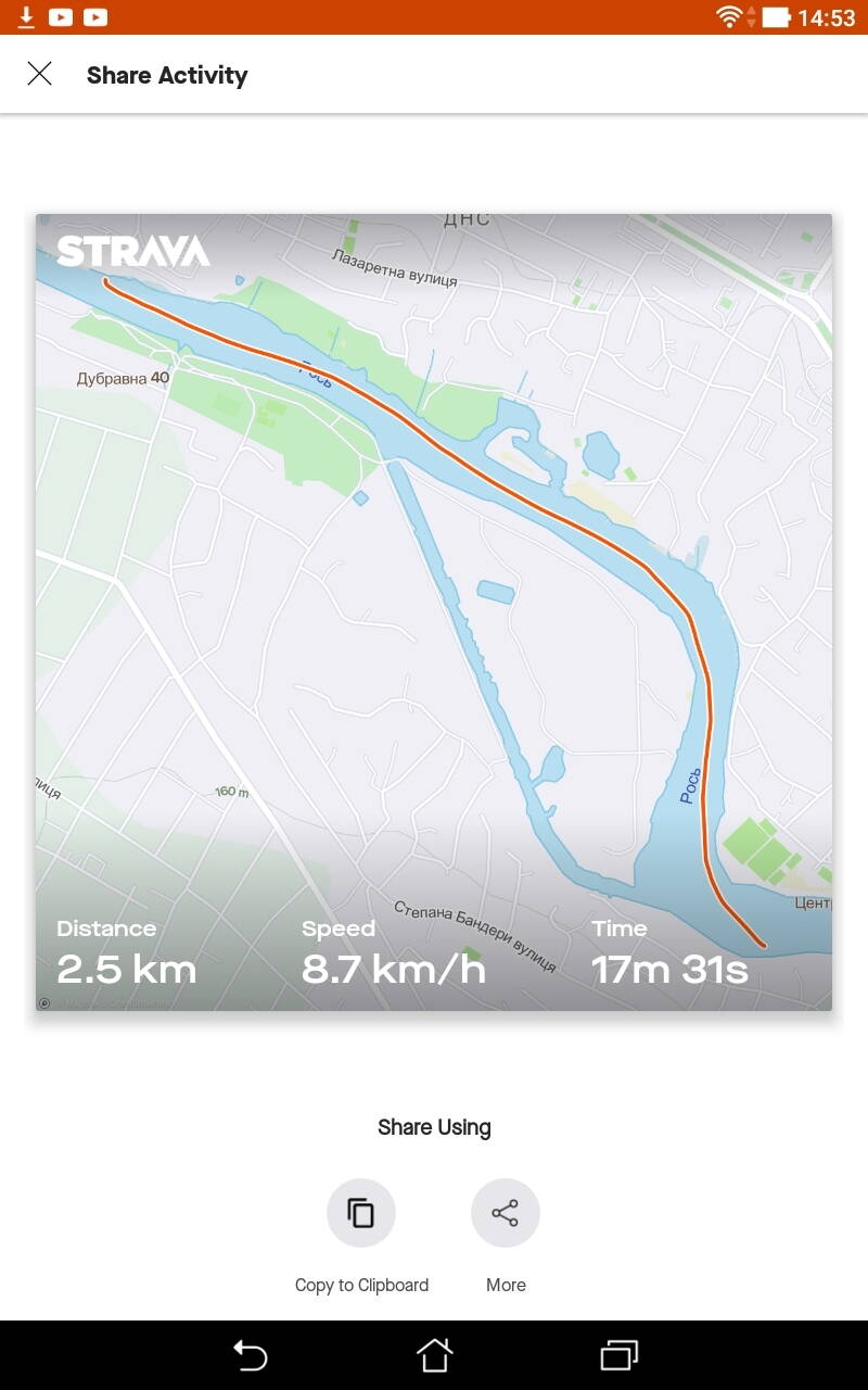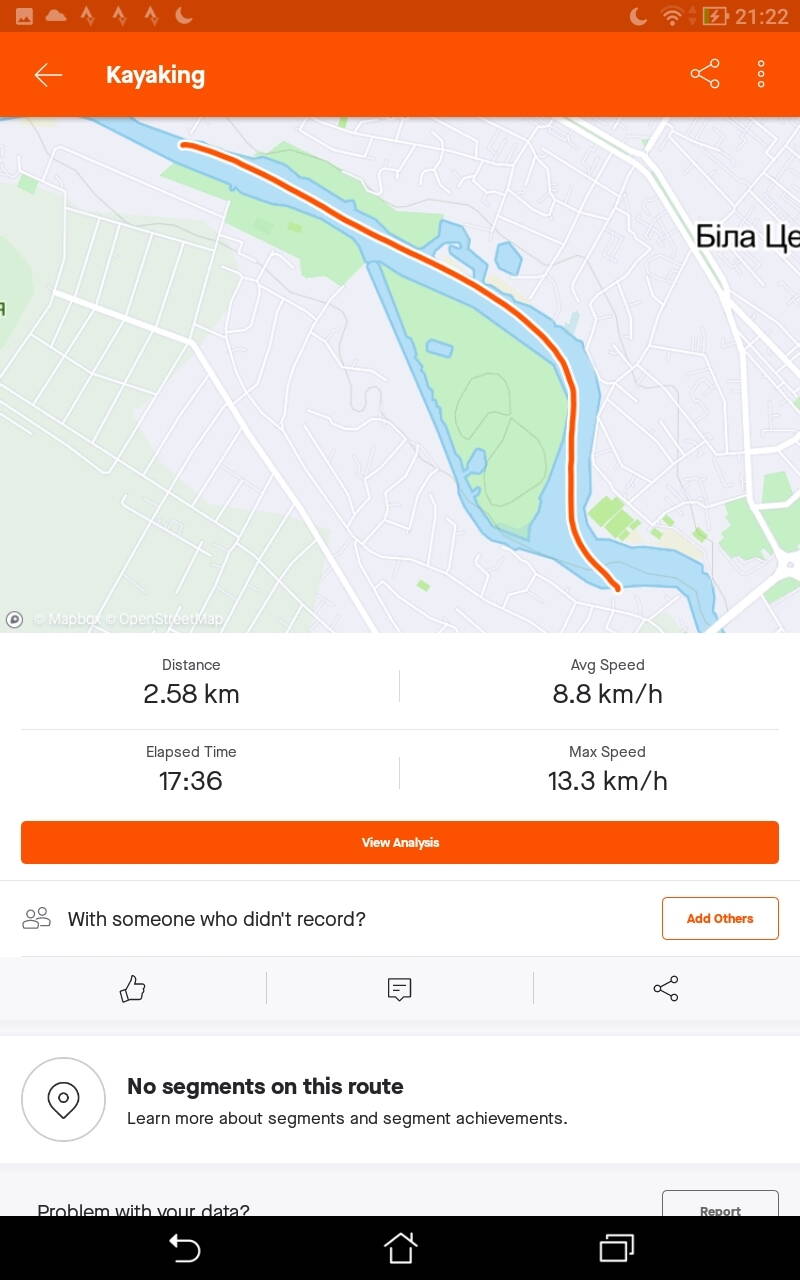 Вирішили установити STRAVA , щоб побачити результати ходу каркасної туристської байдарки з одним веслувальником під парними веслами. Течія на цій ділянці дуже слаба ( перед греблею), русло звивисте і повно на берегах рибалок.