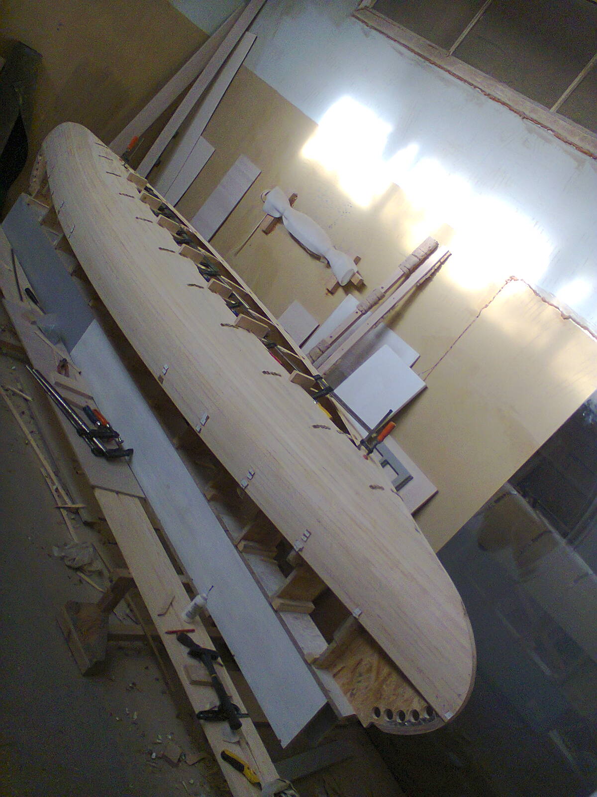 Поскольку корпус Фрея, в дальнейшем, будет армироваться базальтовой тканью, а она сама по себе относительно прозрачная, а потом все это еще будет за армировано черной эпоксидной смолой и покрашено черной краской, то я изначально шел по методике постройки, которая позволяет сильно экономить время. (То что я клеил рейки на термо-клей - это сугубо желание проверит технологию сборки, которая позволит в дальнейшем собрать реечный корпус без жутких следов от гвоздей - это к стати получилось)