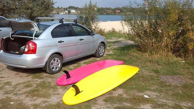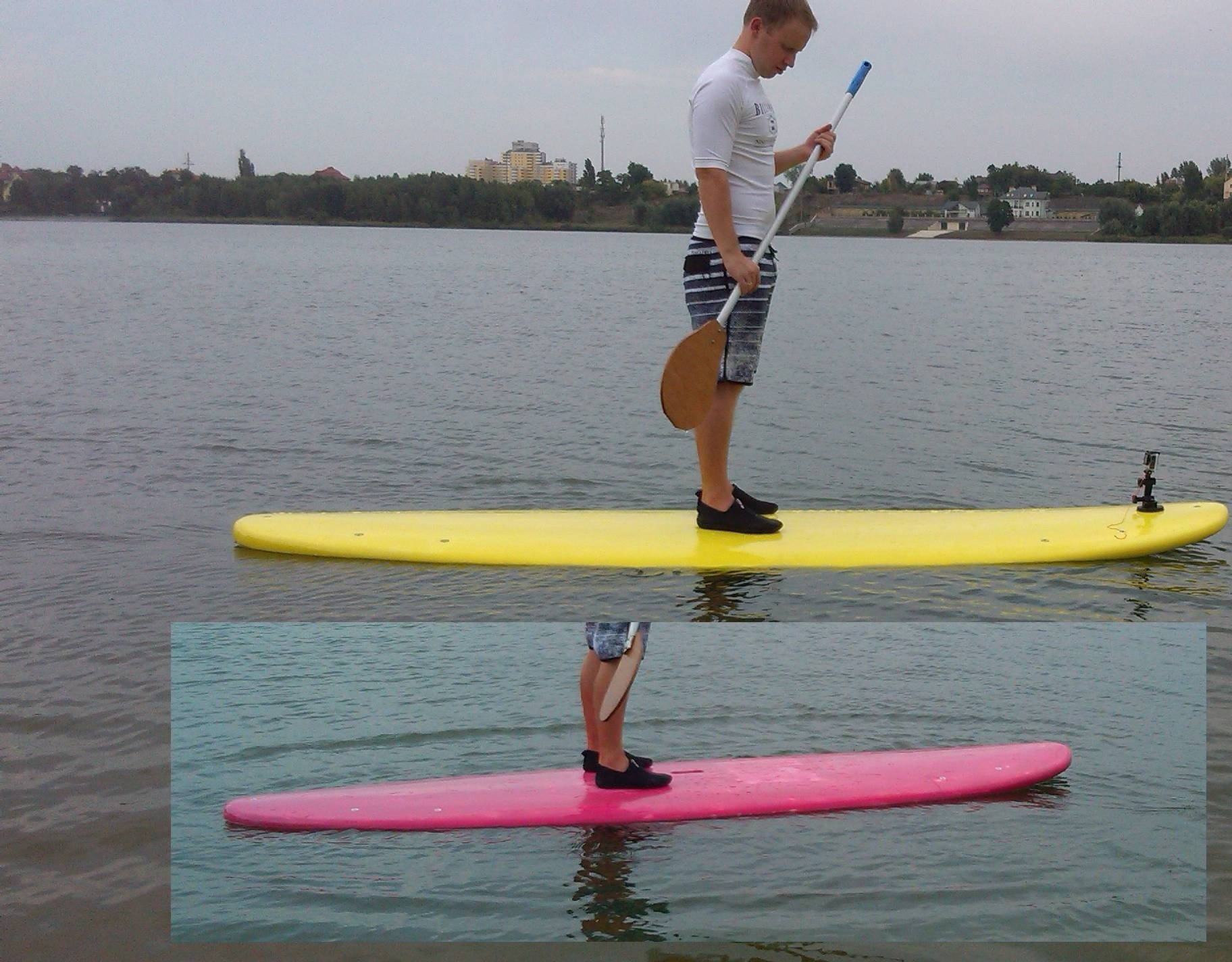 Действительно, САПЫ имеют некоторые отличия. При виде в плане, САПЫ идентичны - 10'x34". Отличия в "литраже" (объеме) и рокере (изгиб). У желтой доски расчетный "литраж" 195 л., подъем носовой части составляет 5", кормовой - 2,5". У сиреневой - 200 л., 4" и 2" соответственно. Нагружали 160 кг (2 человека).