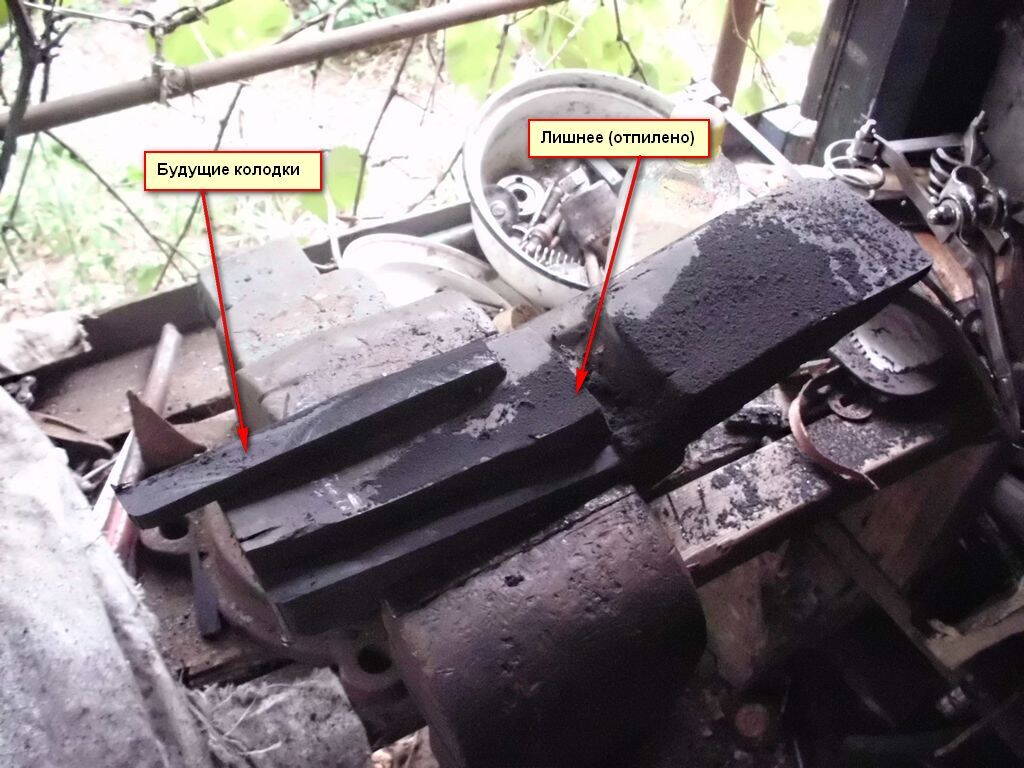 Поэтому я использовал композитные тормозные колодки от поезда. Они отлично встают в родные ХВЗшные корпуса, если немного срезать лишнее: