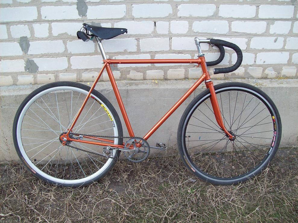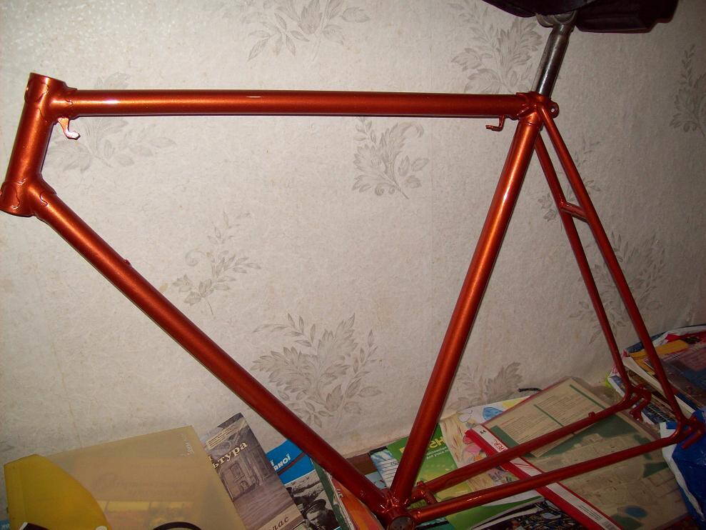 очень долго не возобновлял тему, прошу прощения были объективные причины. с рамой олимпийской серии так ничего и не делал, только вилку доварил. не могу решить красить или так законсервировать и собрать. а пока думаю, занялся рамой 77 г.в. зачистил, два слоя грунтовка эпоксидная, два слоя металлика, два слоя лака. Вот что получилось: обода вейманн, резина кенда, втулки - передняя квандо, задняя чешская велостиль. система ХВЗ. сиденье французкое, б\у. передний обод черный, пока,