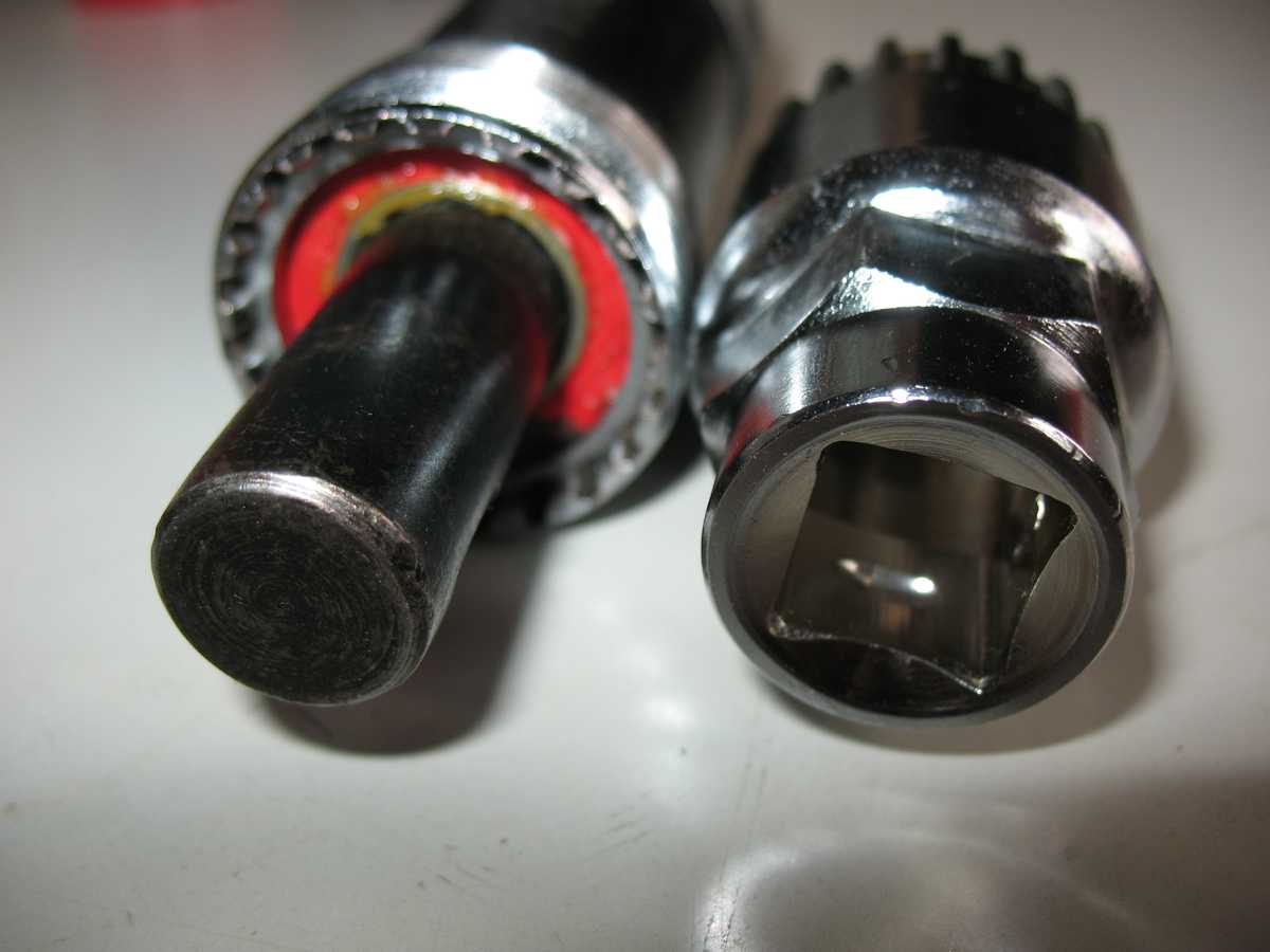 Слева вал короче и там съёмник без проблем достаёт до шлицов на чашке. А вот справа вал длиннее, съ’мник на него не надевается и цепляет шлицы самыми краями. Если бы я пытался ввернуть картридж в неразобранном виде то ничего бы не вышло - края шлицов посрезались бы нафиг.