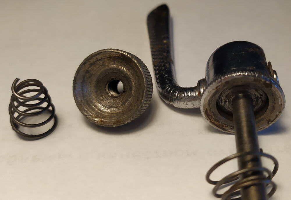 Даже при предельной затяжке (боюсь что лопнет) правая часть оси сдвигается вперёд и колесо начинает тереть левое нижнее перо.
