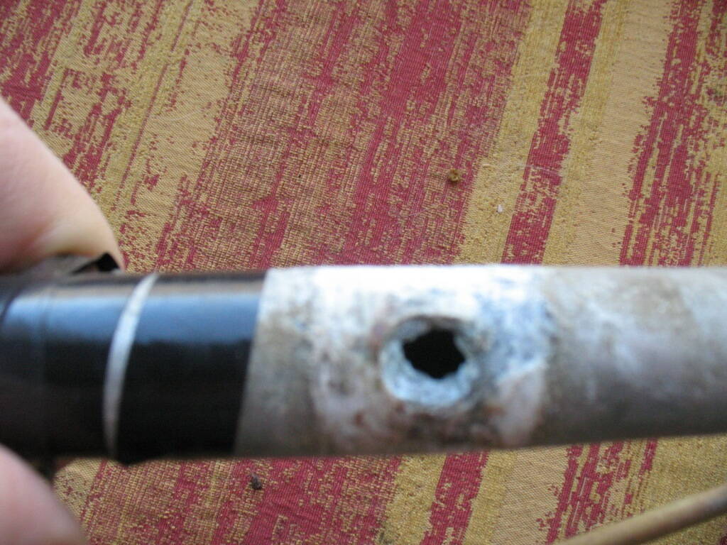 Возможно кто-то тщетно пытался разжать вынос для ослабления руля, но делал это какими-то суррогатными приспособлениями типа каменного топора и палки-копалки, ну случайно пробил отверстие. :twisted: