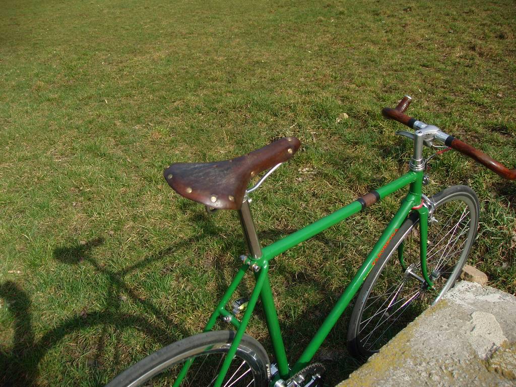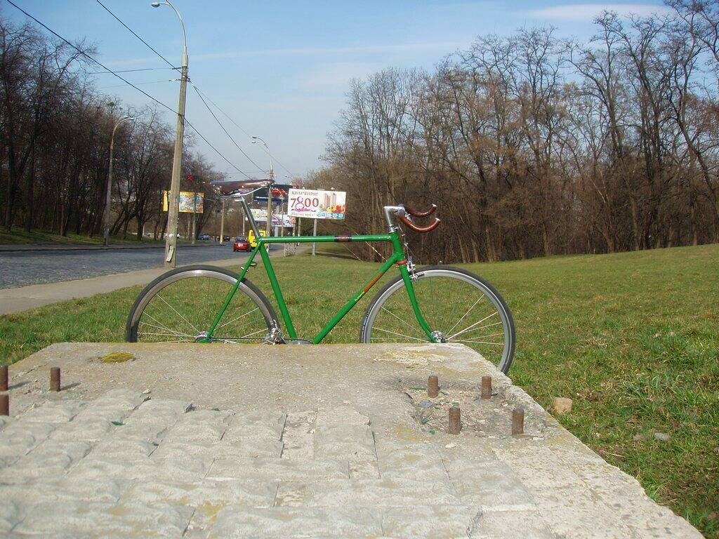 С первой фотосессии изменились мелочи - шина 20 мм спереди, заглушки в руль, блямба-уздечка переднего тормоза и нулёвые педали. Ну шкуры на седле меняю иногда - то отдельная тема. Так, чё-то ехал на Куренёвку на днях, остановился покурить на Подольском спуске - а там места приятные, погода хорошая и вел сразу таким красивым показался :D