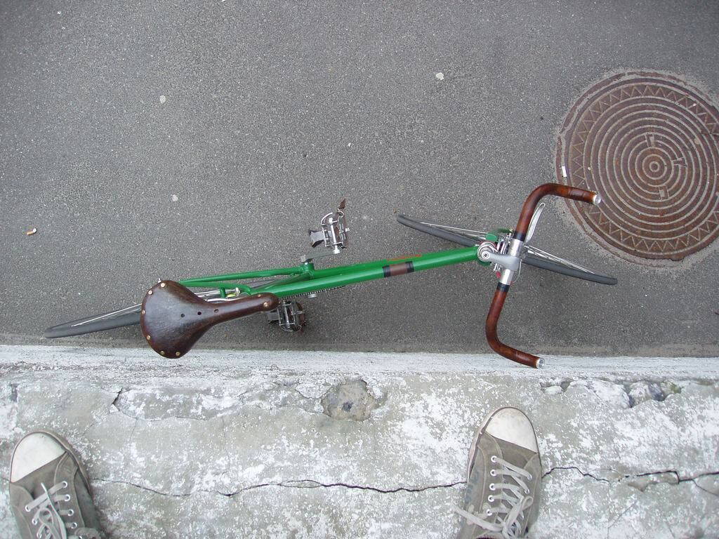 Да, что было - под углом градусов 45-60 въезжал на бровку с.. ну, типа заезд из асфальта приформован. Как-то тени не так легли, он оказался круче, чем выглядел. Одну ногу успел вырвать из туклипса. Слетел с сидухи, с размаху сел на правую половину руля. Колесо при этом повернулось на 90°, а я продолжал лететь вперёд и вниз. Половина руля прогнулась миллиметров на 30, на спице разлетелась головка. Отак :velo3: