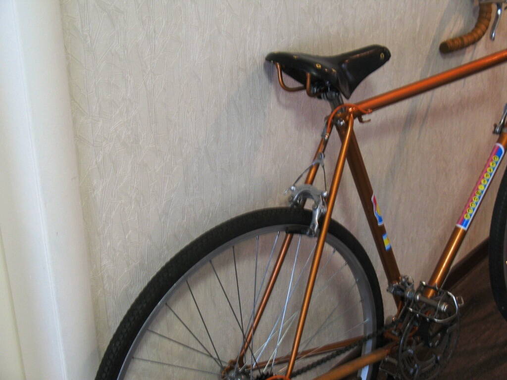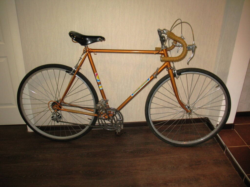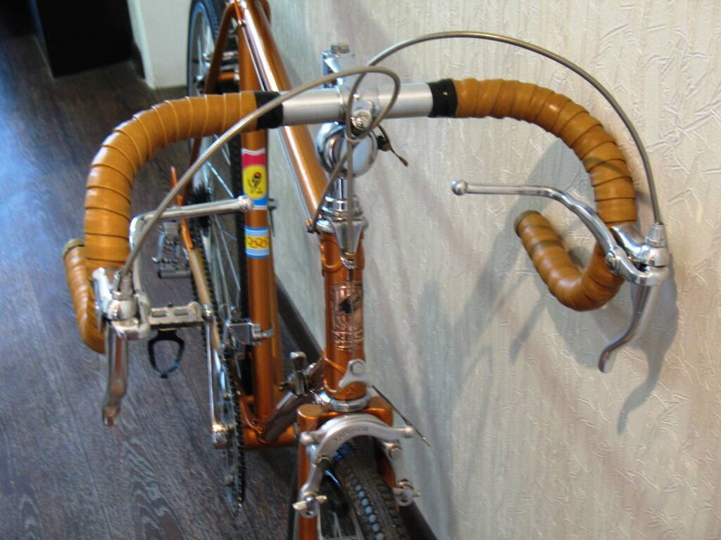 Ну собственно вот.Итог сочинения на тему "Как я провёл зиму".Пока на родных колёсах, ибо брать новые "жаба душит" а из бэушных не подберу пару к хорошему переднему с разборки итальянского шоссера. Предворяя желающих высказаться по поводу винтов седла-"я знаю что вы можете мне сказать, а некоторые даже знают, что я могу ответить" :D , других не нашёл.Голые оплётки тормозных тросиков-это не ошибка и не экономия-это моё представление о прекрасном :smile: .Они даже отхромированы.А рыжей оплётки я взял с запасом и поменять можно всегда, при желании.