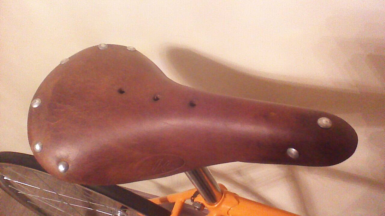Опять же во время ожидания колес закончил седло. Ранее оно было вымочено в желатине и зашкурено. После просушки на примере Kisa просто покрыто бесцветным кремом для обуви и отполировано, получился естественный кожаный цвет. В процессе использования, думаю, еще больше полирнется пятой точкой и будет вообще бомба. Собирал на дюралевых заклепках из Метизыча на Куреневке (тоже не реклама :) ) Расклепывал только одну заклепку на носу седла. Остальные были пропилены вдоль и разогнуты. Предварительно прокаливал на плите, ибо без прокаливания усы просто ломались, а после нагревания дюраль становится более пластичным.