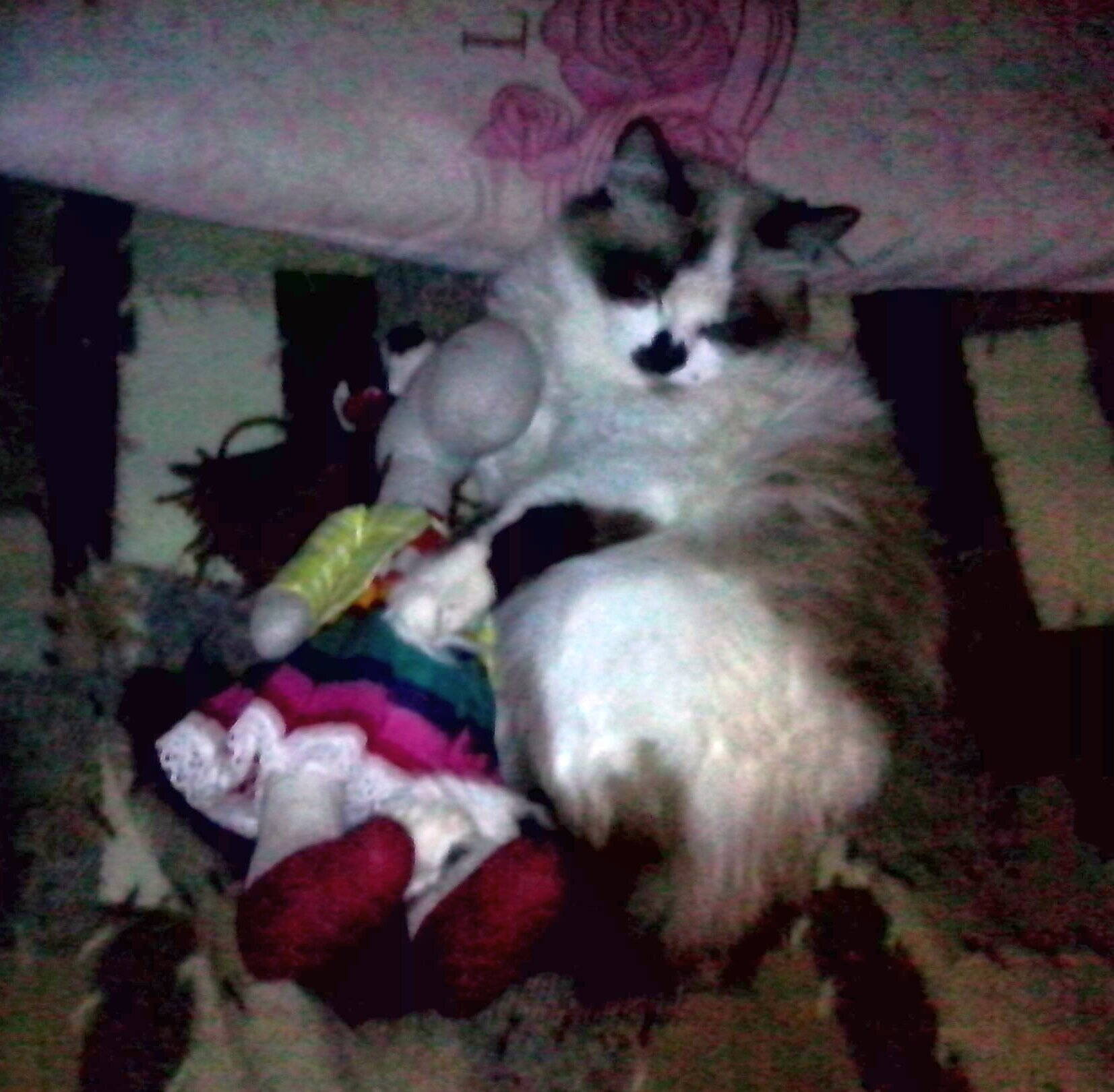 В ожидании Деда Мороза наша кошка уснула в обнимку с игрушечной лошадкой, фото на телефон :oops:
