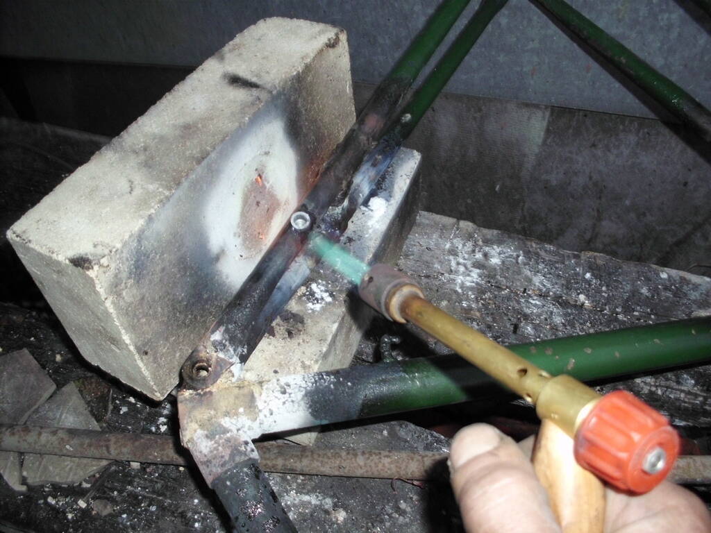 Тут же на фотке видны бонки под багажник (к покрашеной раме паял :facepalm: :ROFL: ) - они паялись в последнюю очередь, и на них не хватило кислорода. Поэтому пришлось тулить их пропан-воздушной горелкой ГВП-246 и не пожалеть серебра, ибо до латуни она не догревает даже такие относительно немассивные трубы: