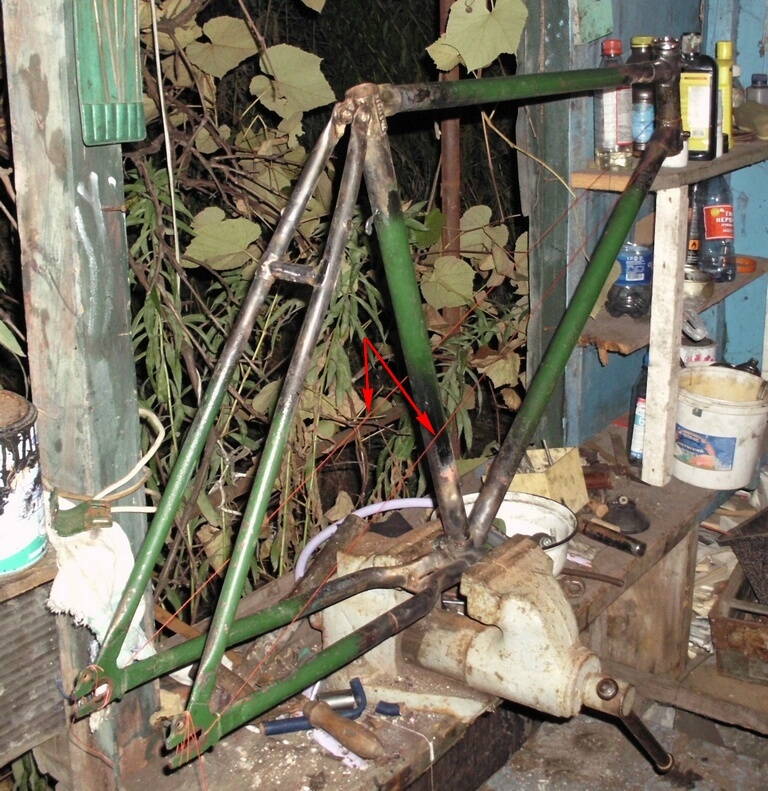 Ещё до меня там шатуном протёрли нижнее перо, а отремонтировали, приварив арматурину :facepalm: Причём дырка осталась :D Я тогда арматурину оставил, а дырку аккуратно заварил электричеством, на фотках ранее это заметно.. Сейчас же с радостью срезал её нах, чтобы придать раме культурный вид:
