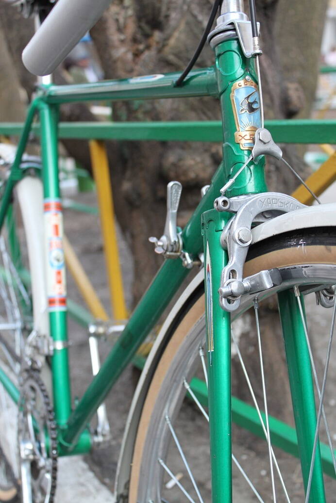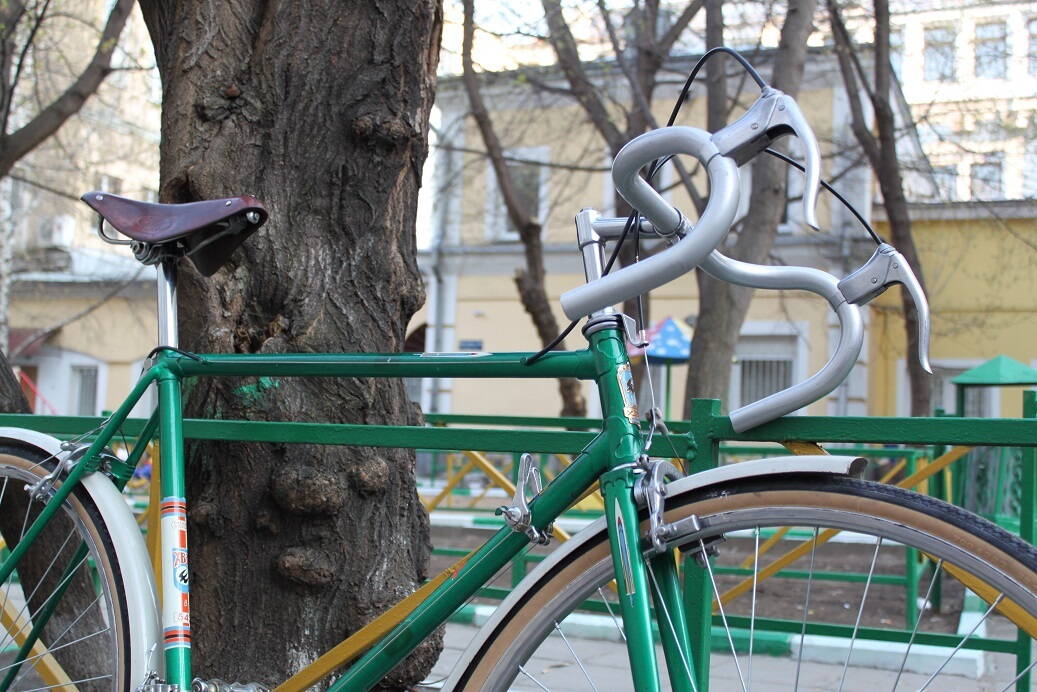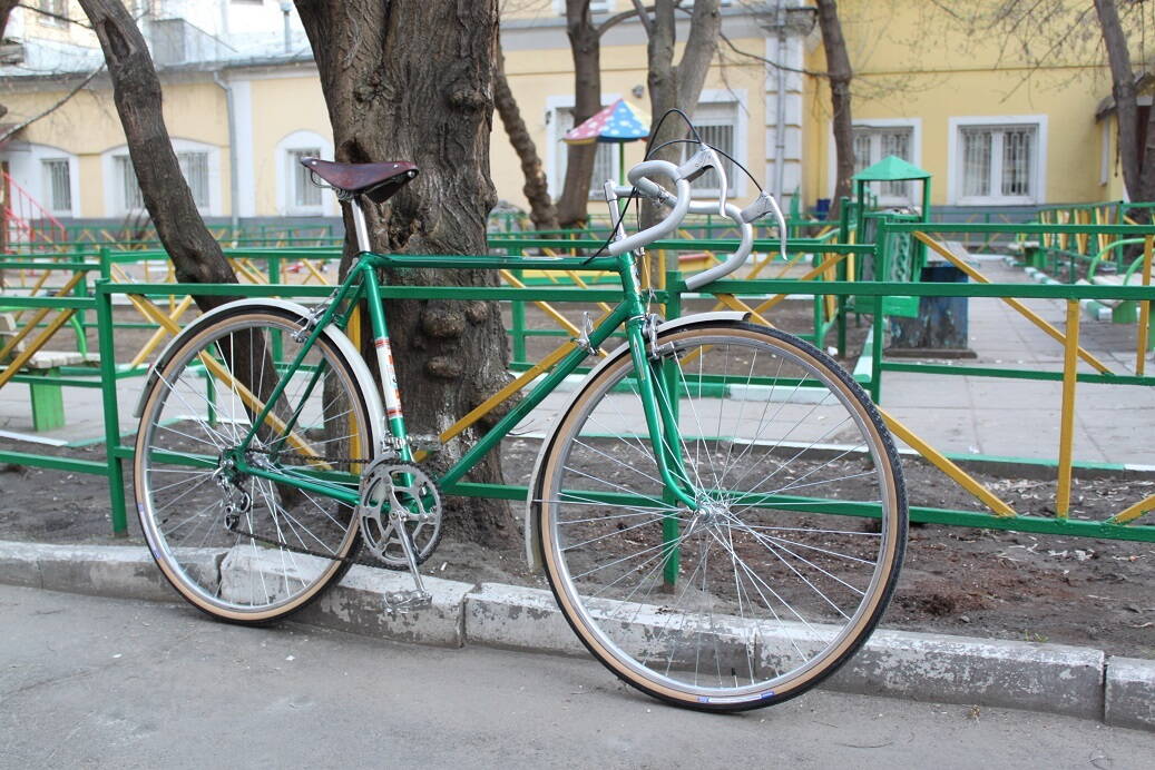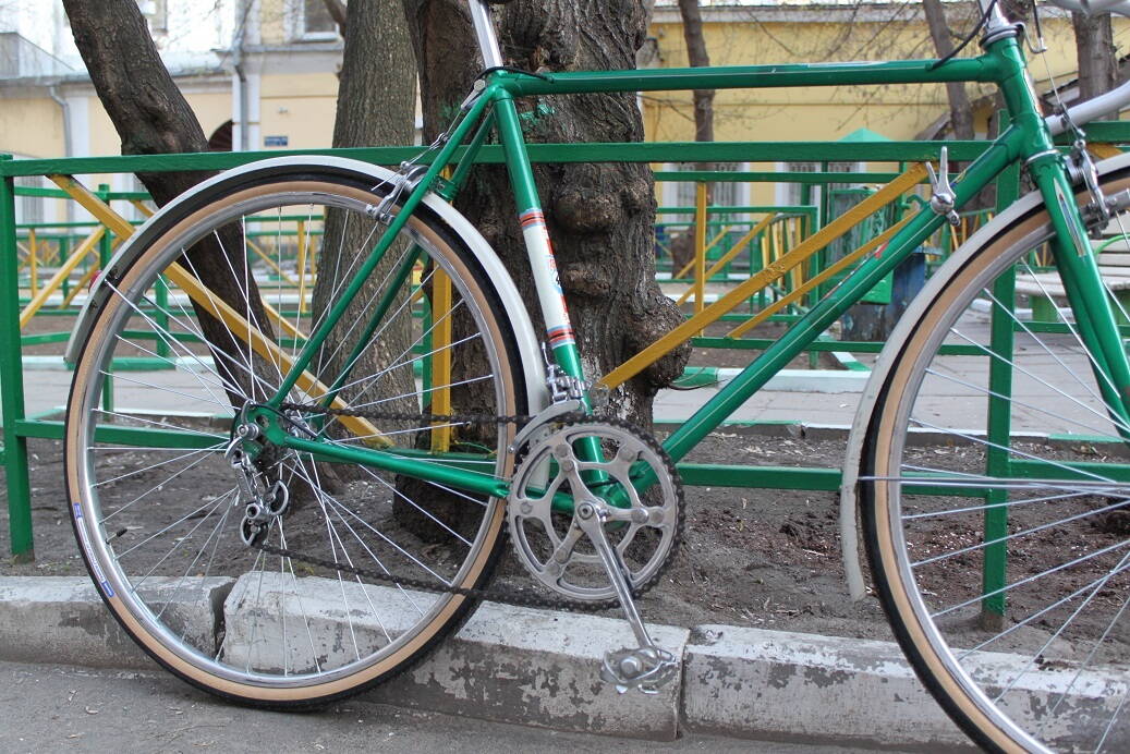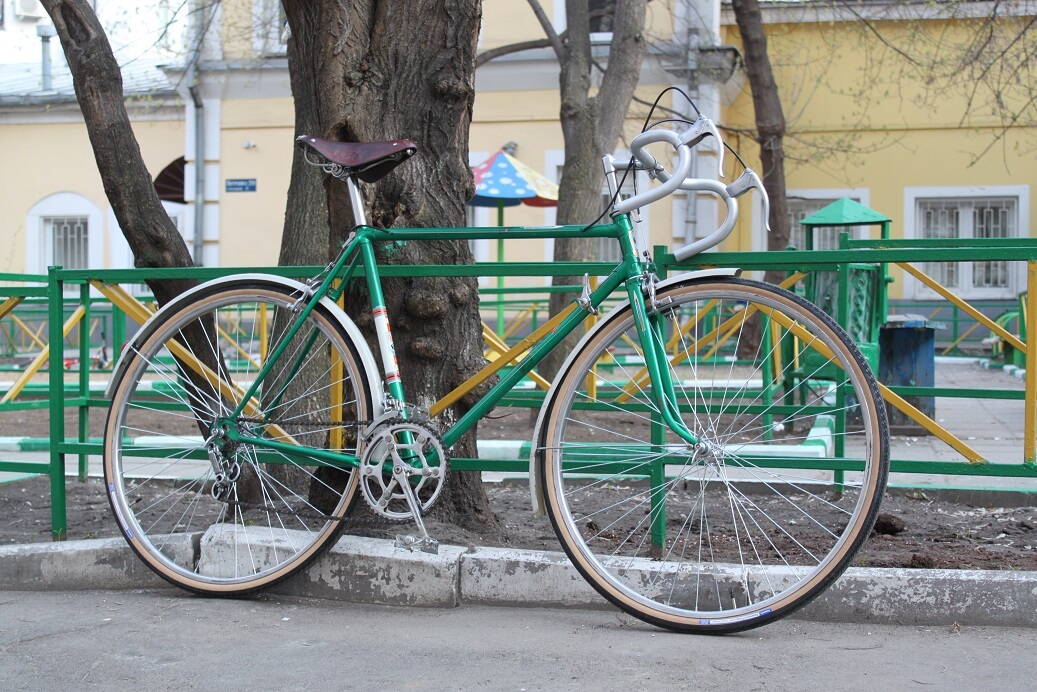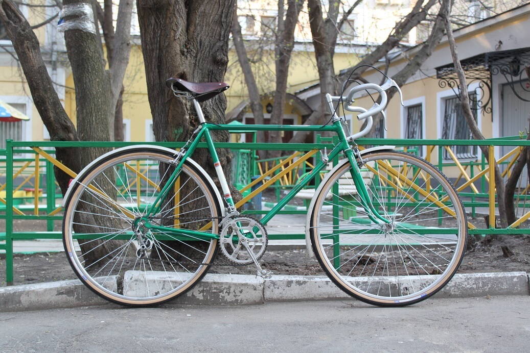 Прошу прощения, что задержал работы и долгожданную фотосессию. Сегодня закончил основные работы, осталось навести мелкие приятности - добавить туклипсы на педали (есть аутентичные тех годов с кожаными ремешками), настроить натяжение седла, добавить обмотку и поставить заглушки на торцы руля, также настроить трансмиссию более тщательно, разобраться с заедающим тросом заднего тормоза (в первый раз с такими капризами сталкиваюсь, переберу все и смажу проводку силиконом), еще такой момент - тормоза воют просто навзрыд, такое ощущение, что колодки очень недовольны тем, что их заставляют работать после стольких лет покоя)))