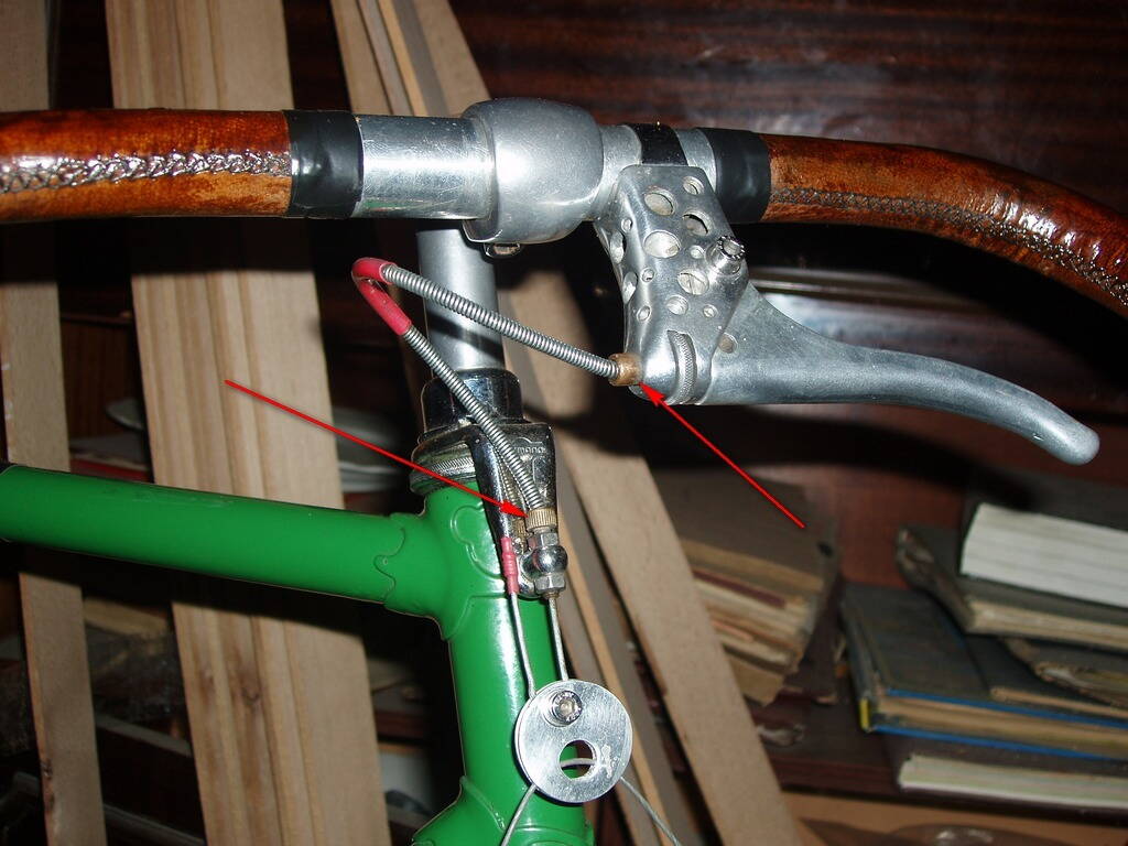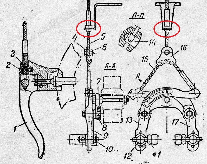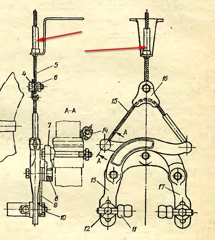 А не должна на клюве переднего тормоза стоять ещё фигнюшка латунная - типа направляющая рубашки троса и регулировка, типа как на стартоне? (на картинке из книги малопонятно, как там коней рубашки оформлен)