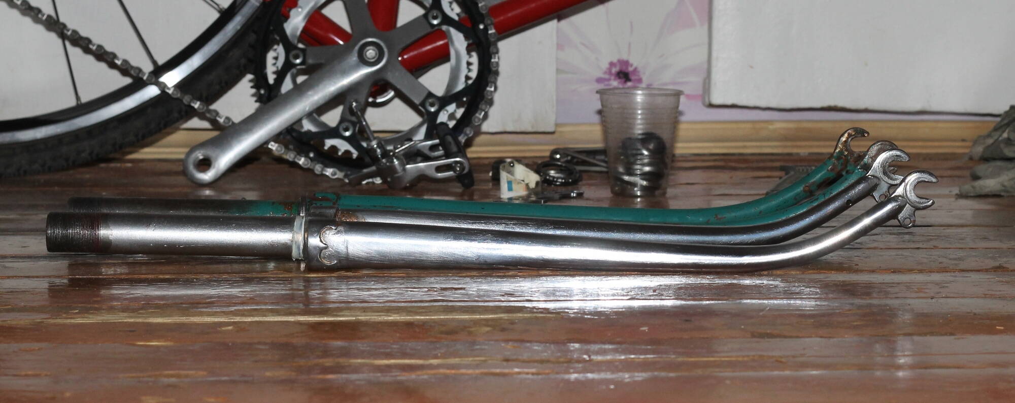 Таким образом встал выбор поставить хромированую вилку с тормозами Tektro или красить зеленую и ставить тормоза Sora.
