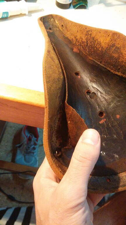 1)Отодрать её.Зачистить места клея и приклеить по новой.Наружную сторону тоже немного отшкурить и пропитать воском вместе с седлом.