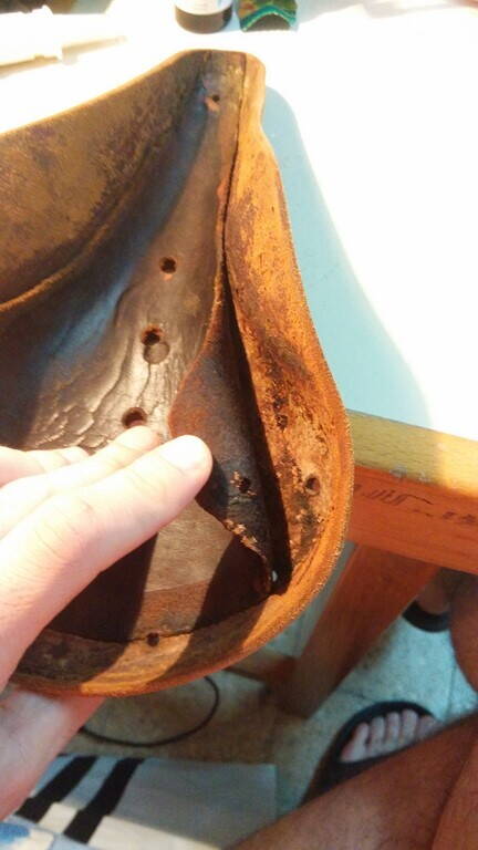 Всем привет.Я уж как-то спрашивал,но спрошу ещё раз как лучше поступить.Вышкурил черпак,осталось решить что делать с внутренним вклеенным куском кожи.После вымачивания этот кусок по бокам начал отклеиваться.Клей очень старый,шкурка спокойно отрывается руками,плюс ещё и визуально потресканная.После вымачивания и просушки,этот кусок стал твёрдый,как фанера.Будто сломать можно. Какие варианты я вижу: