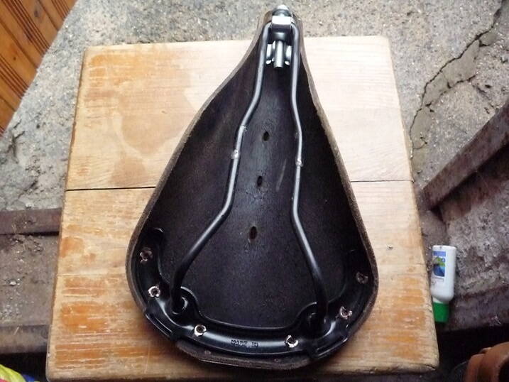 Я не спец. Первый опыт общения с кожей. Могу ошибаться, но наверное в прошлой жизни за седлом не ухаживали в принципе, скорее всего стоял велосипед где-нибудь на улице в любую погоду и катались на нём потом не просушив седло. И переворачивали вел вверх колёсами наверное частенько где-нибудь на асфальте, есть довольно сильные потёртости в характерных местах. Винт натяга не выкручен, седло не натягивалось. Может показаться странным, но мне на нём было удобно.
