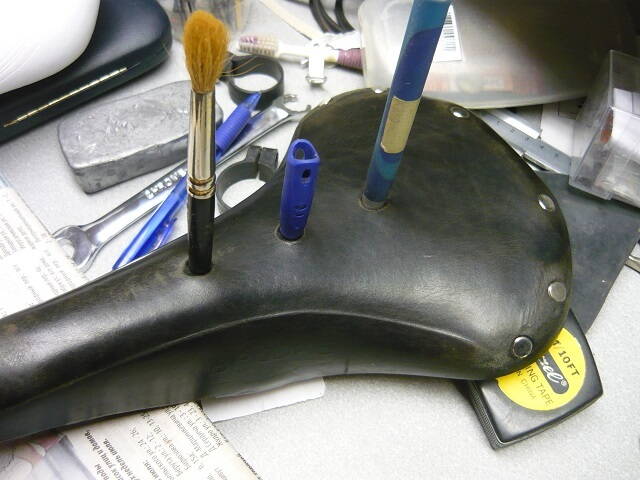 С изнаночной стороны седла пипеткой пролил тёплую воду вокруг этих вставок. Кожа размягчилась и приняла нужную мне форму. Потом решил слегка само седло подправить. Немного смочил, типа "под дождь попал" и пожмякал руками , придавая форму , близкую к родной. Зафиксировал резинками через пенку.