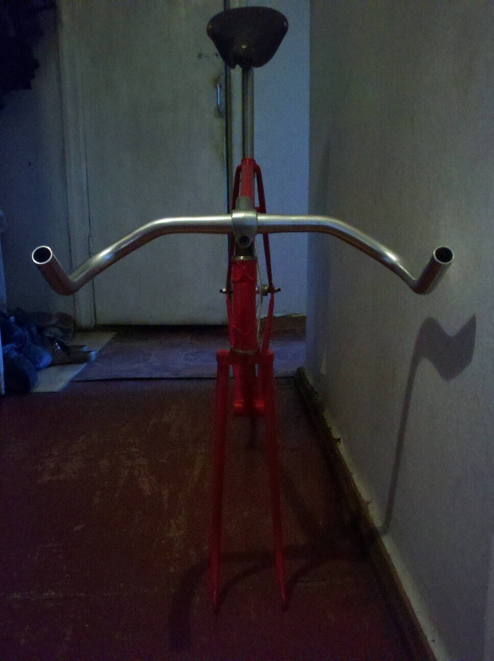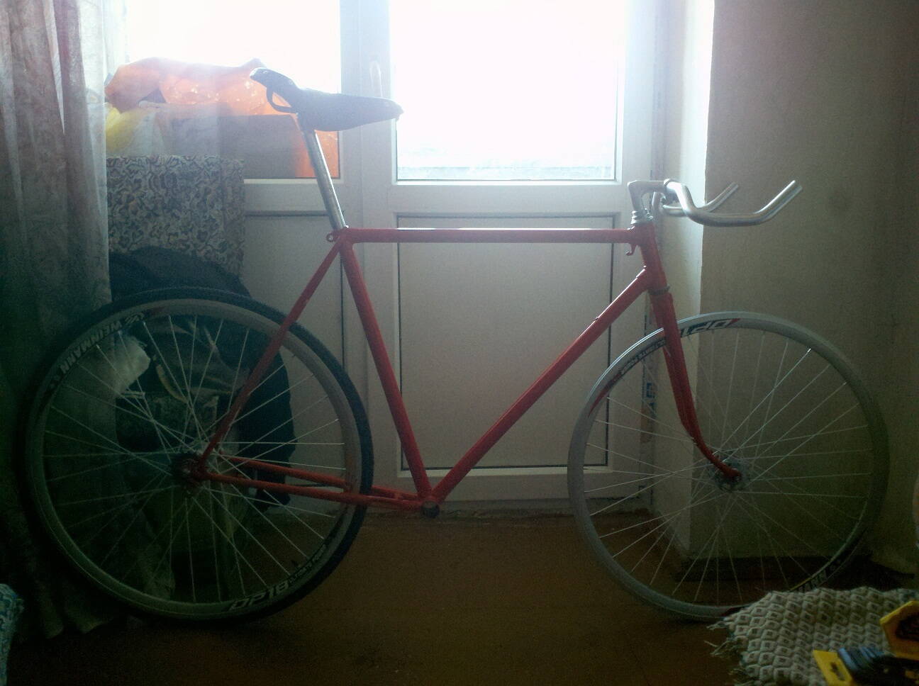 В общем,так сказать,к сезону готов.Езда на фиксе конечно интересна.По ощущениям словами не передать :roll: Расчёт оказался для меня удачным,ездить на нём легко и быстро.Без обмотки на руле конечно не особо мягко,но то дело такое.Оригинальное седло на много лучше чем мягкое шоссейное.Для натяжителя в нос седла подобрал обычный потолочный крюк с резьбой на штифте,отпилил до нужной длинны и всё готово.Туклипсы удобнее чем ХВЗ-шные,но всё равно стоит привыкать.