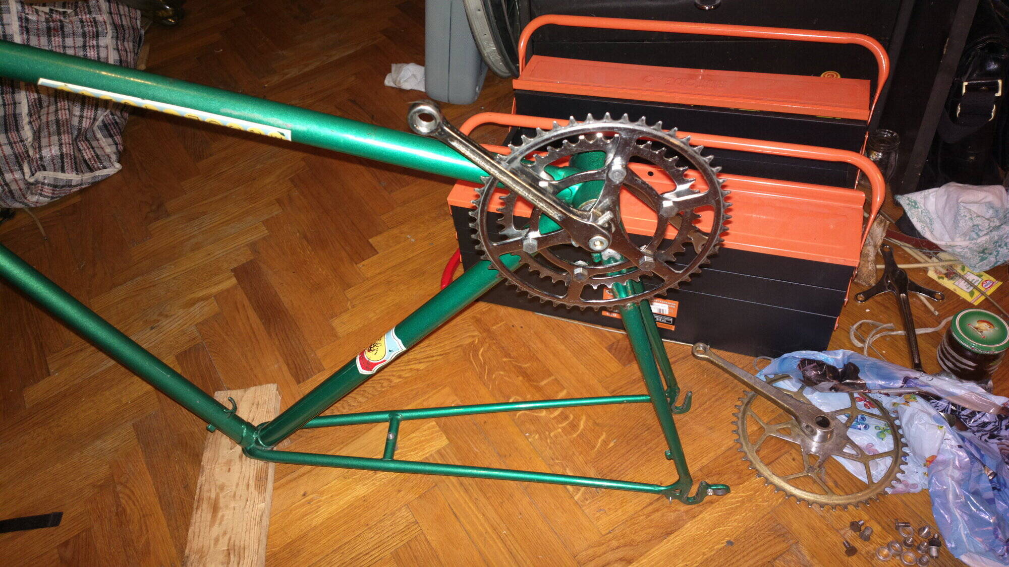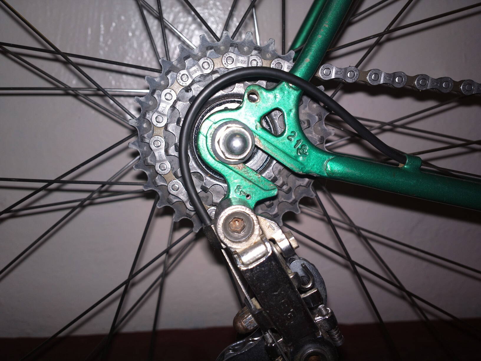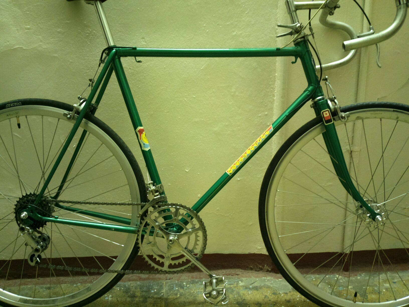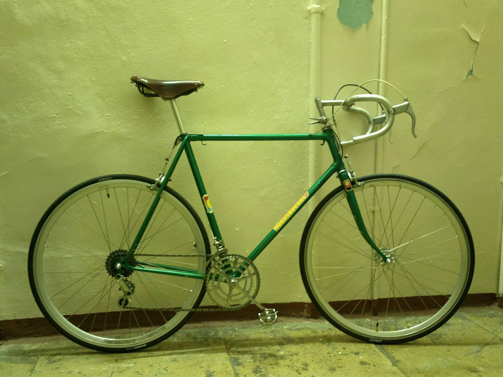 Втулки самодельные, на древних промах, после переборки (с матами, бубнами и складыванием всех пыльничков и гаечек стопочкой) стали плавно и жырно крутиться. Когда разработаются, жыр наверное уйдет и останется легкость, надеюсь, что люфт не придет - до переборки он был. При снятии трещотки HERO (что за контора такая, кстати?) порвал верх, куда съемник вставлять. Сходил подумать. Пока ходил чесать репу, нашел еще одну порваную трещотку HERO в своих "стратегических запасах" (забавно, но я порвал точно такую же точно таким же способом, пытаясь ее снять, лет так 12-13 назад), а еще нашел старую трещотку со своего Спутника - такой же No-name пятерик, но в туринговый уклон + нормально сделанный верх под съемник обеспечили ему долголетие. Перебрал, накру... эээ, резьба какая-то хитрая... хенд-мейд блин... в общем, докрутил с ма... эээ... ...с усилием. Обода Рейнбоу ДА-30, не ругайте, отдали с рамой, не за бесплатно конечно же, согласился взять только из-за втулок (смачно сплюнул) двойные.. типа... (смачно сплюнул). Не, нормальные обода, тока вот почему у них яйца на месте шва (стык от проката)?! Ладно, подумаешь, лишний вечер покорячился за станком... Да и внешне такие смотрятся только на маленькой раме - а на раме большой ростовки нужно невысокие обода, чтобы не скрадывать радиус колеса. На шины с камерами денег не пожалел - Кенда 700х23, преста, все дела. Много чего из полезной мелочевки и нужной механики было любезно предоставлено Владом, за что ему огромное спасибо. Переключатели и манетки не потребовали ничего, кроме чистки и настройки. То же самое с тормозными ручками. Руль я взял свой старый со Спутника.