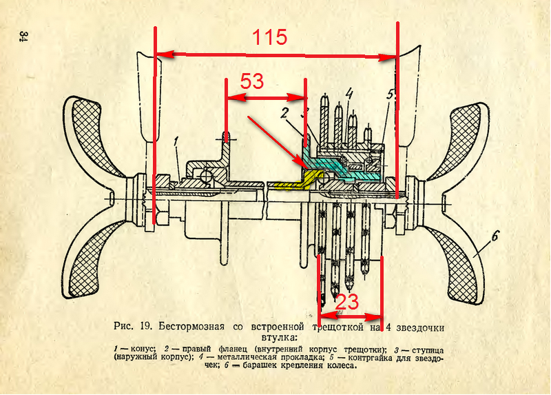 О, Серёж, я ж тебе втулку на три звезды померял старинную (звёзды толстые, типа сингловых, обод на том колесе - узкая чайка. Кольцо, что стопорит звёзды - резьбовое. Размеры вот. Ну это затасканый по форуму чертёж, причём с четырьмя звёздами, там шопопало нанесено, но размеры для себя найдёшь: