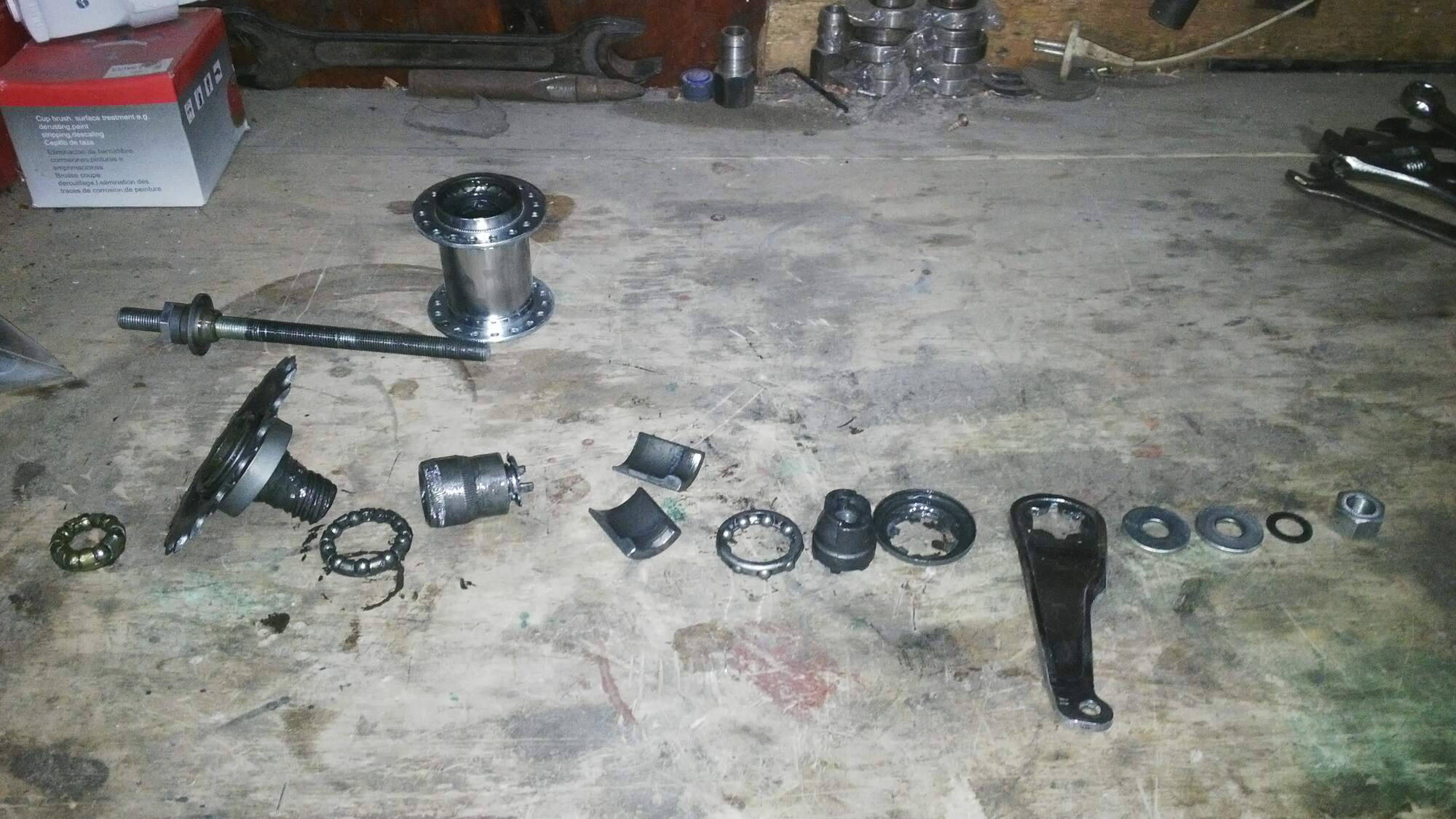 После замены тормозного рычага и обоих больших подшипников (малый не пострадал) втулка стала опять вполне годна к работе, и сегодня на этом велосипеде уже ездил.
