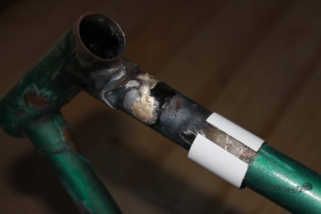 Места будущей пайки зачистил металлической щёткой на дрели, заодно посрезал все бонки, крючки крепления насоса и петуха за ненадобностью. (планируется односкоростной велосипед для местных поездок за пивом и на озеро)