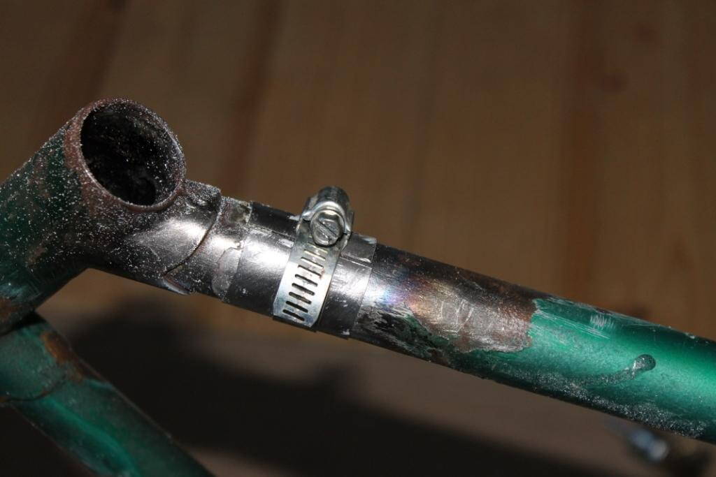 Чтобы припой плавился требуется прогревать металл до покраснения. Труба рамы тонкостенная и прогревается без проблем. А вот уже узел стыка трубы и рулевого стакана я прогреть не смог, там толстый металл и хороший теплоотвод.