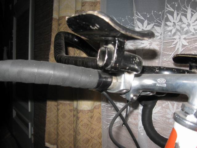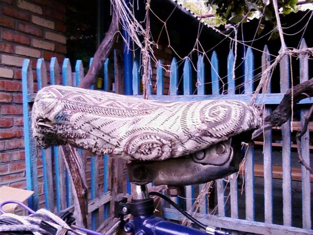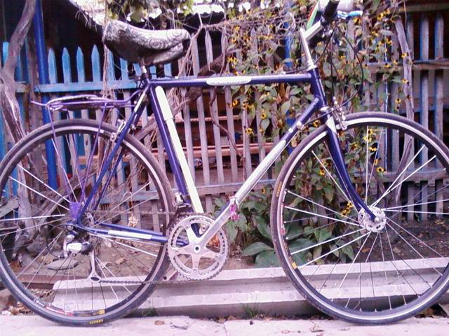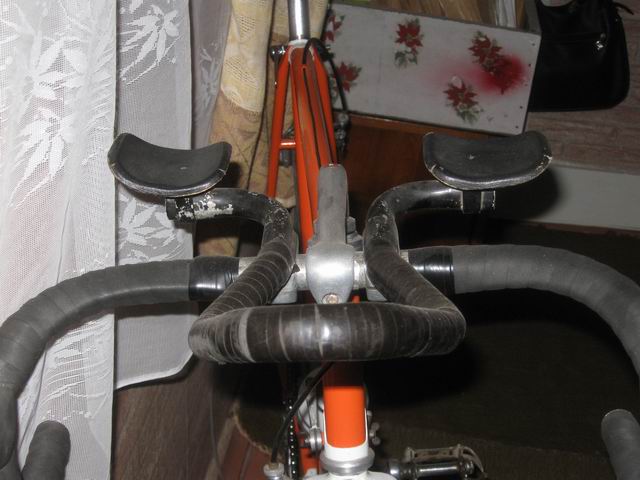 :-)На этом велосипеде теперь ездит мой отец(110кг)по этому здесь такое модное седло. Система шоссейная(самопал из лопасти самолёта-кованая и фрезерованая моим хорошим знакомым.Прототип Campagnolo Record 180mm, звёзды ХВЗ 52/44),трещётка шоссейная shimano (13/14/15/17/19/21/24),передний переключатель на три звезды shimano FD-TZ30,задний shimano alivio.Резина Kenda на передок 23 на зад 25. Ручки и грипсы без названия. Остальное без изменения :-)