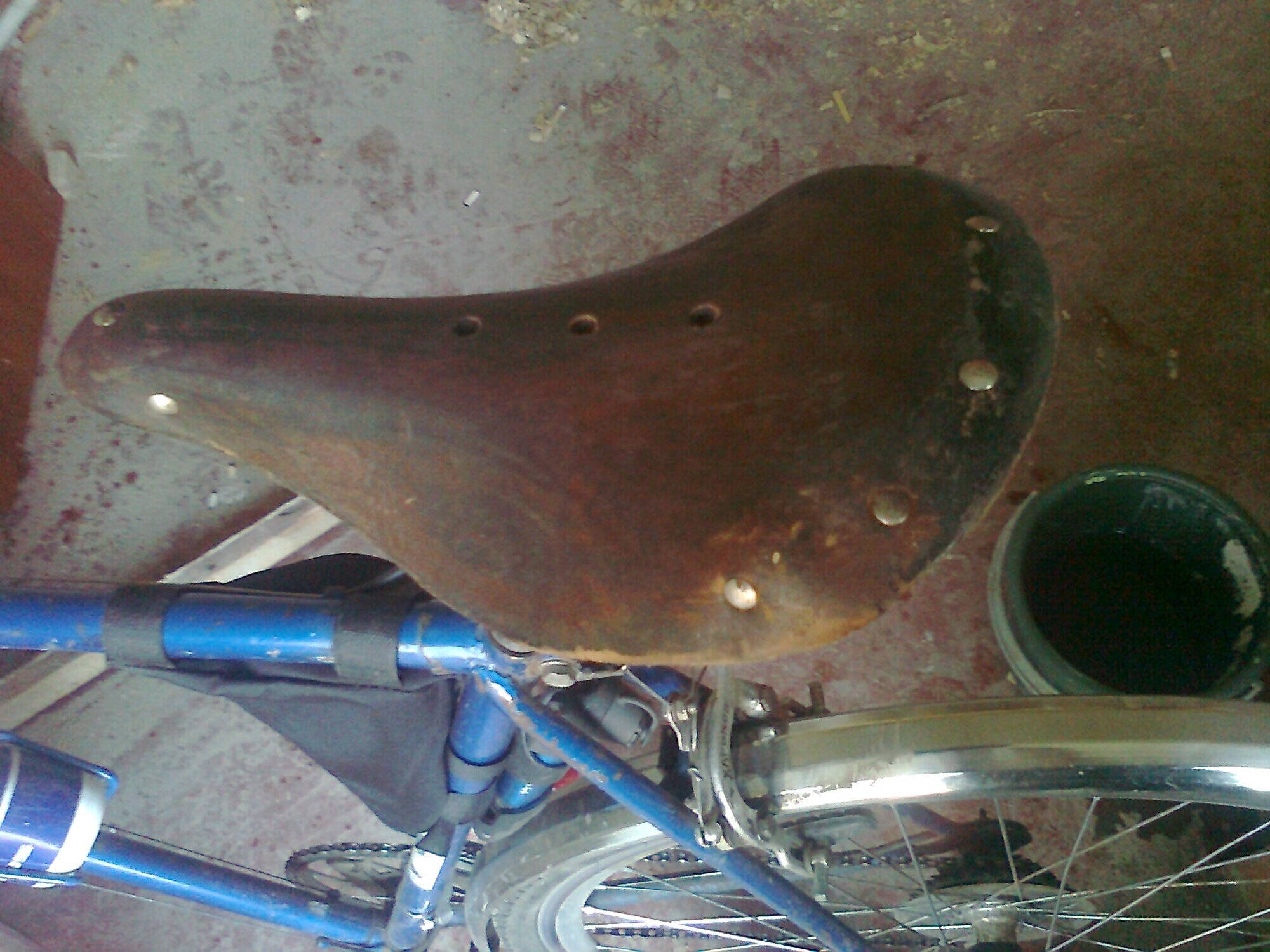 Сегодня получил долгожданное седло и сразу же перекинул кожу на рамку с седла донора, установил :oops: Рамка и замок, заклепки пролежав двое суток в растворе лимонной кислоты приобрели вид "как новые", что очень порадовало. На фото видны разводы - это слежалые остатки замшевого чехла, перед поездкой надо будет куском джинсы сверху "шлифануть", сама кожа целенькая и радует состоянием если бы не чуть коцнутая рамка (которую можно вылечить сваркой), то седло пришло в состоянии - ставь и едь :yes: Заклепки хоть и позиционируются как одноразовые, прекрасно расклепались и удерживают кожу на рамке.