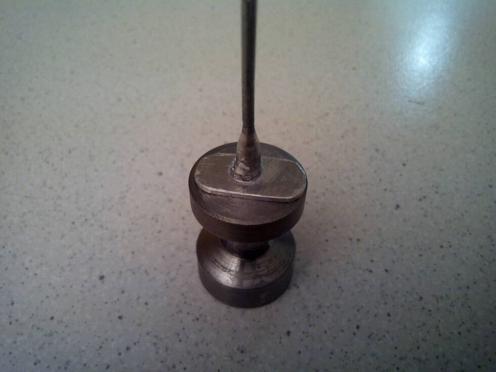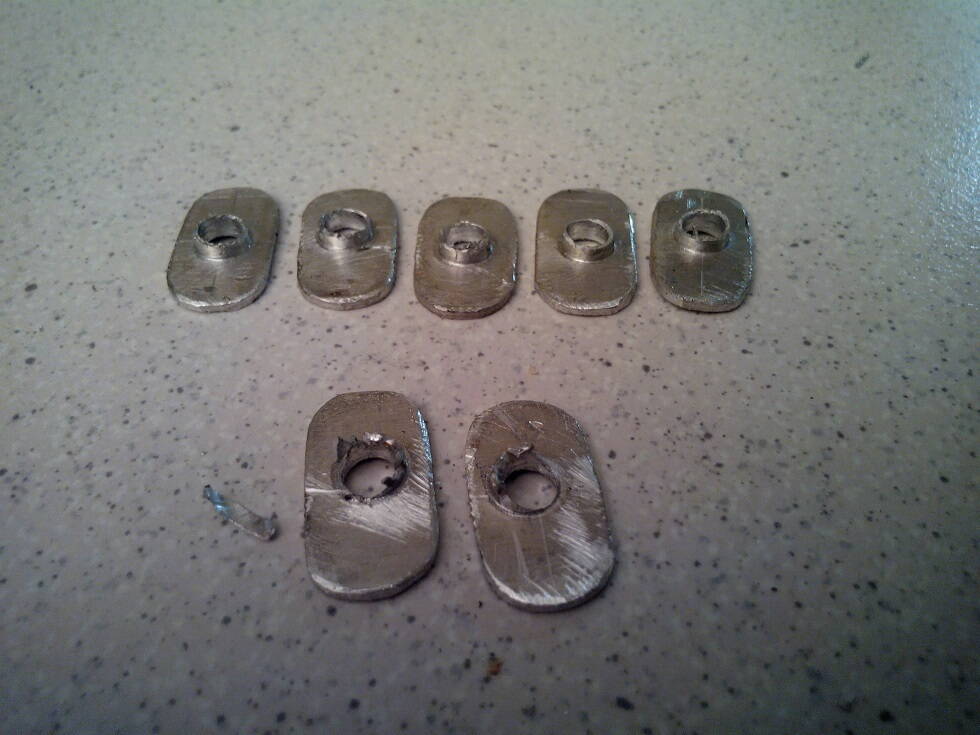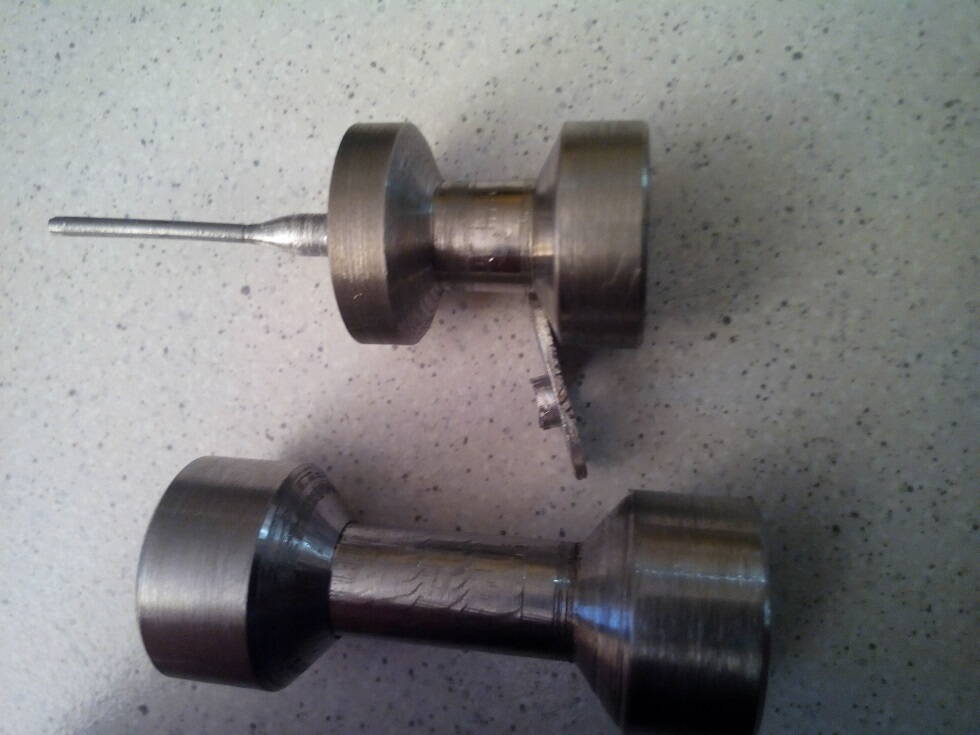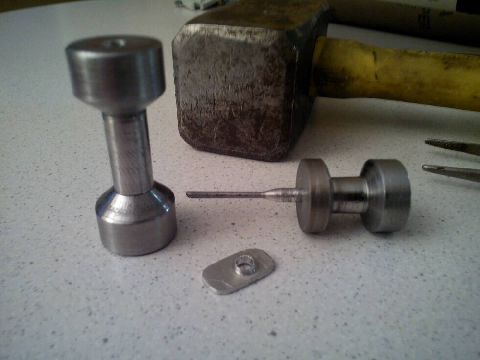 Изготовлена приспособа для вытягивания отверстий. Сделано пробных пару шайб (нагрев, пинцет, приспособа, молоток). Получается.