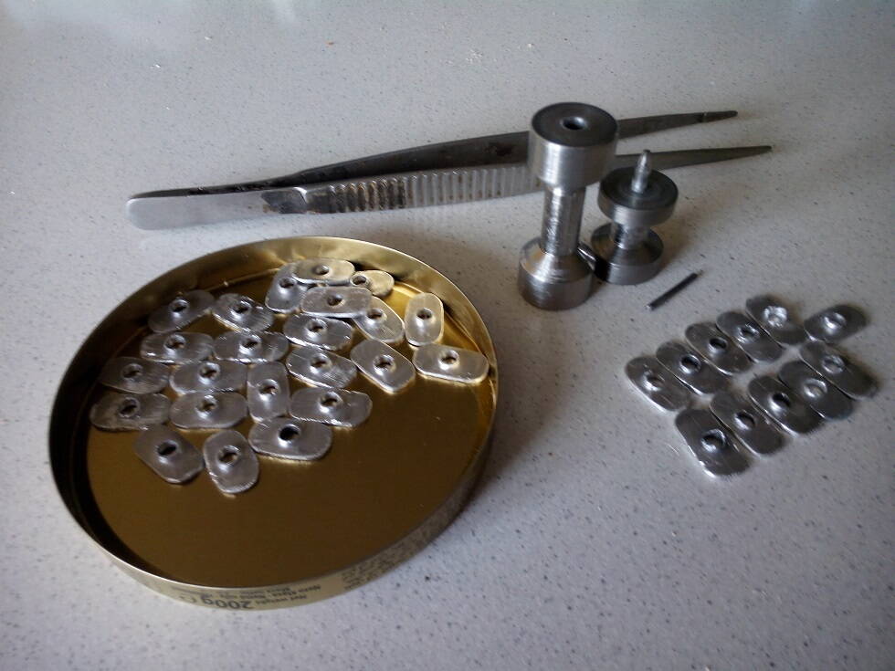 Ещё вывод: не следует заниматься обработкой шайб до штамповки - много брака, труд в пустую. Намечать отверстия керном нужно после порезки шайб, а не на листе, в процессе резки материал деформируется и метки получаются не по центру заготовки.