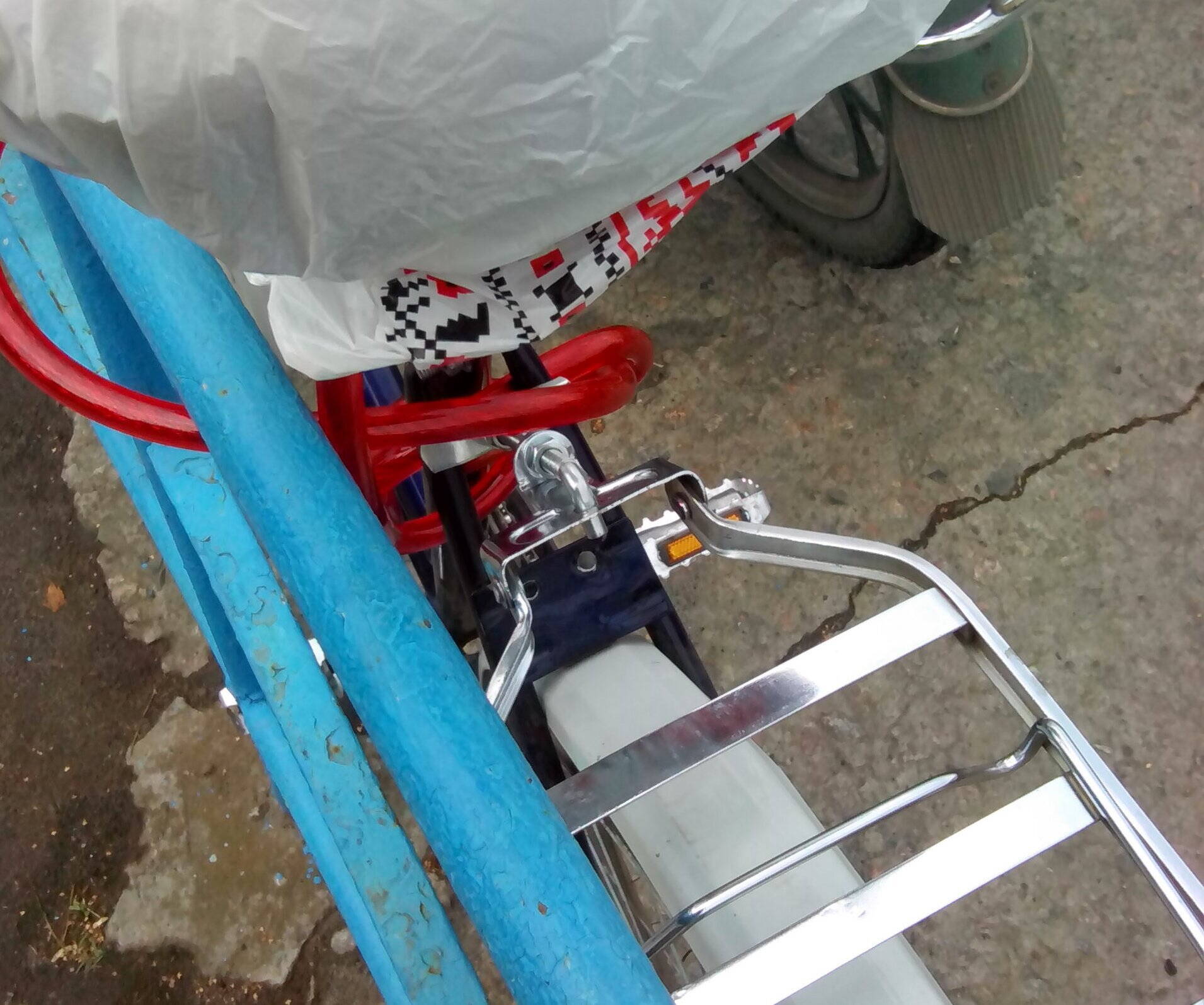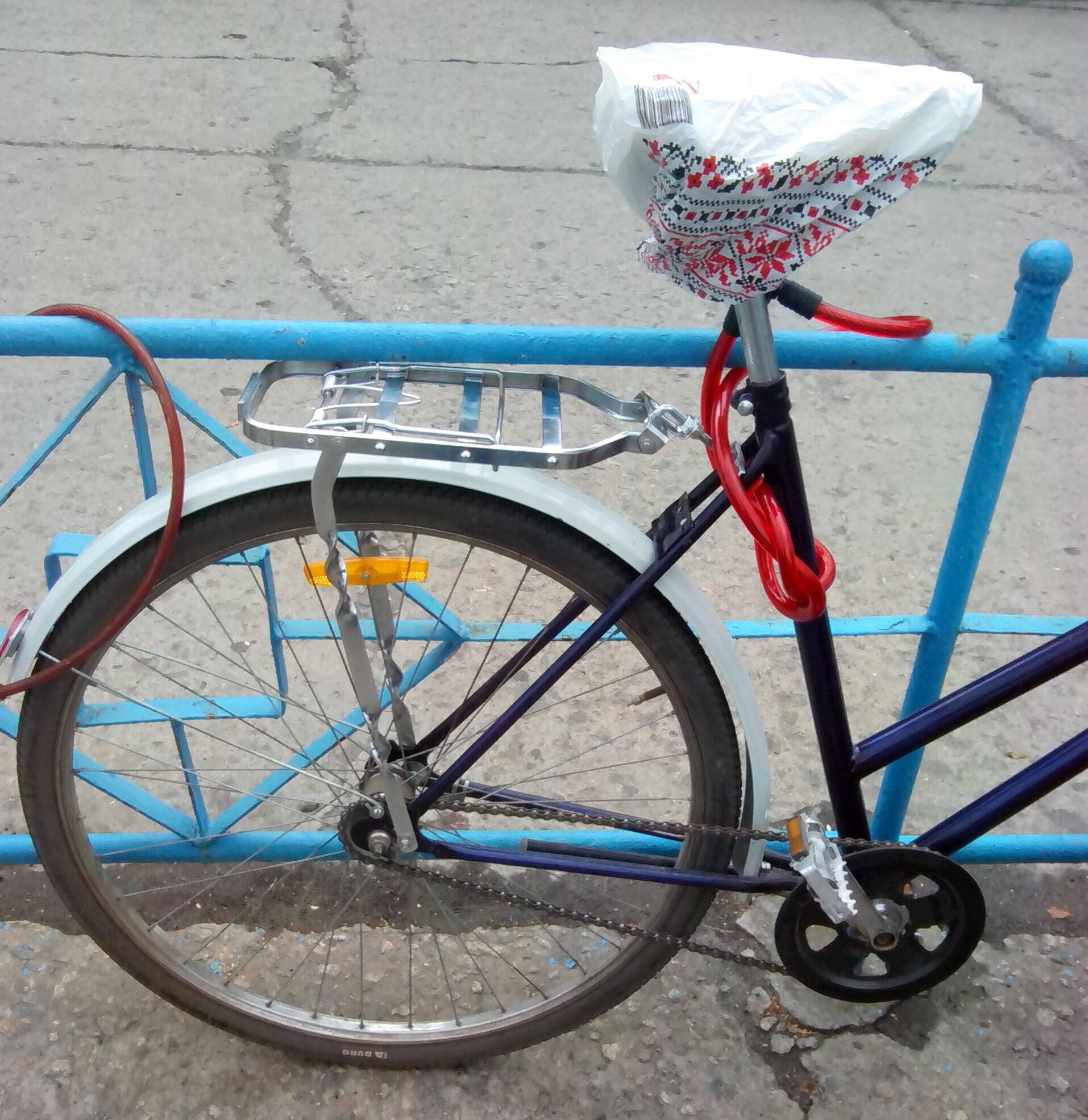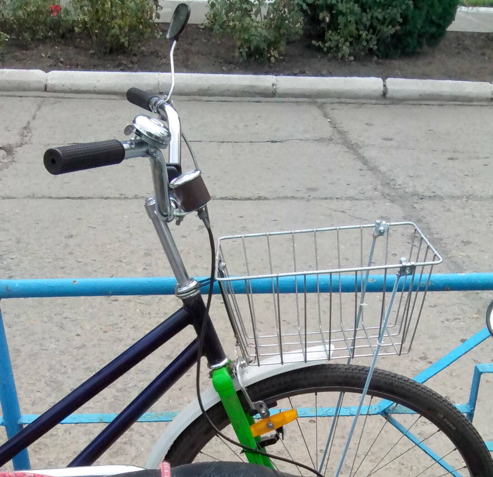 Очередные раскопки на балконе принесли чудесную металлическую корзинку на руль, правда без креплений, и я колхозил во всю.
